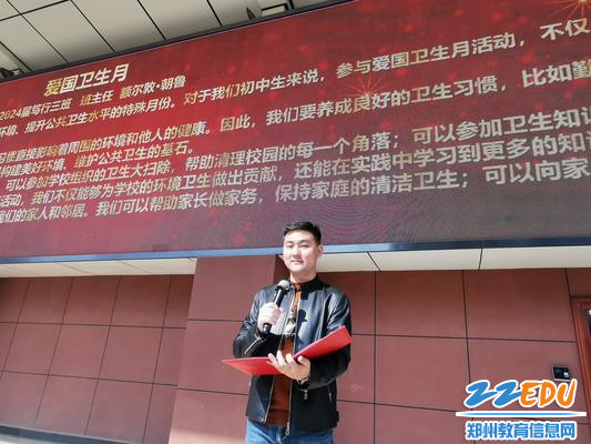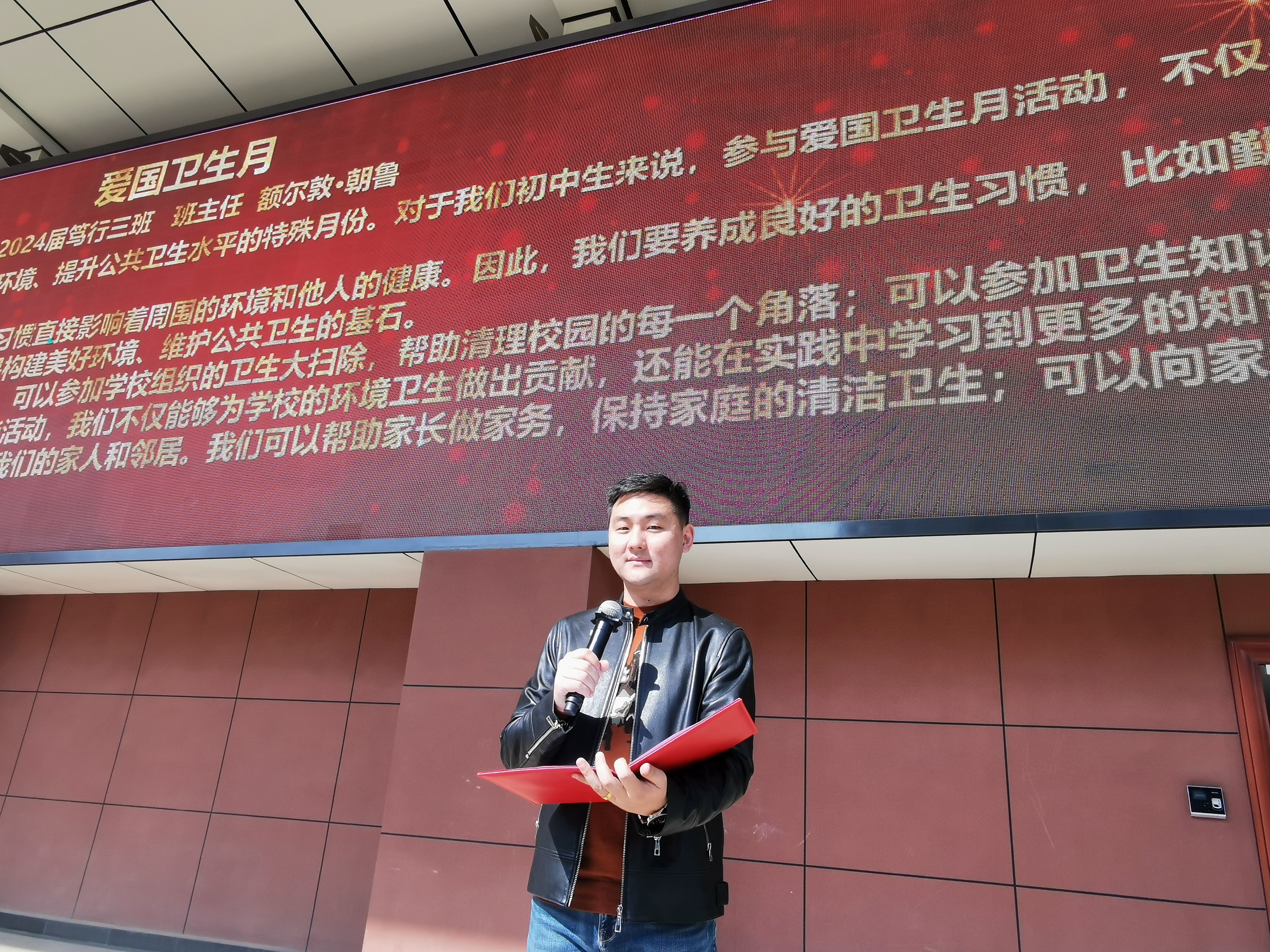 接着,2024届笃行3班班主任额尔敦·朝鲁老师也作了《爱国卫生 从我做起》的国旗下发言。他表示,爱国卫生是一个充满意义与责任的话题,它不仅关乎我们个人的健康和成长,更关乎国家的繁荣和稳定。一个健康、卫生、文明的社会环境,能够为我们的学习和生活提供有力的保障。因此,我们要将爱国卫生的理念内化于心、外化于行,让它成为我们日常生活的一部分。