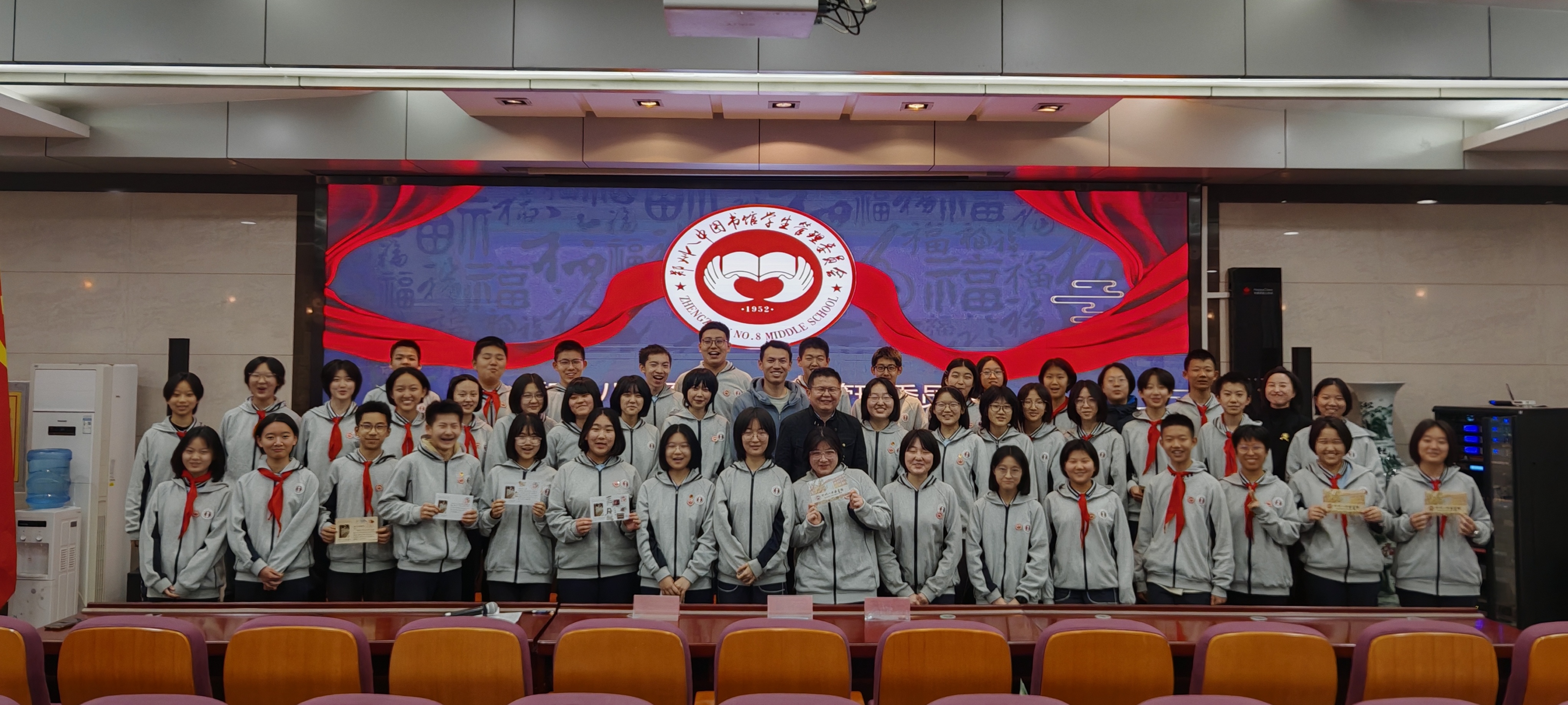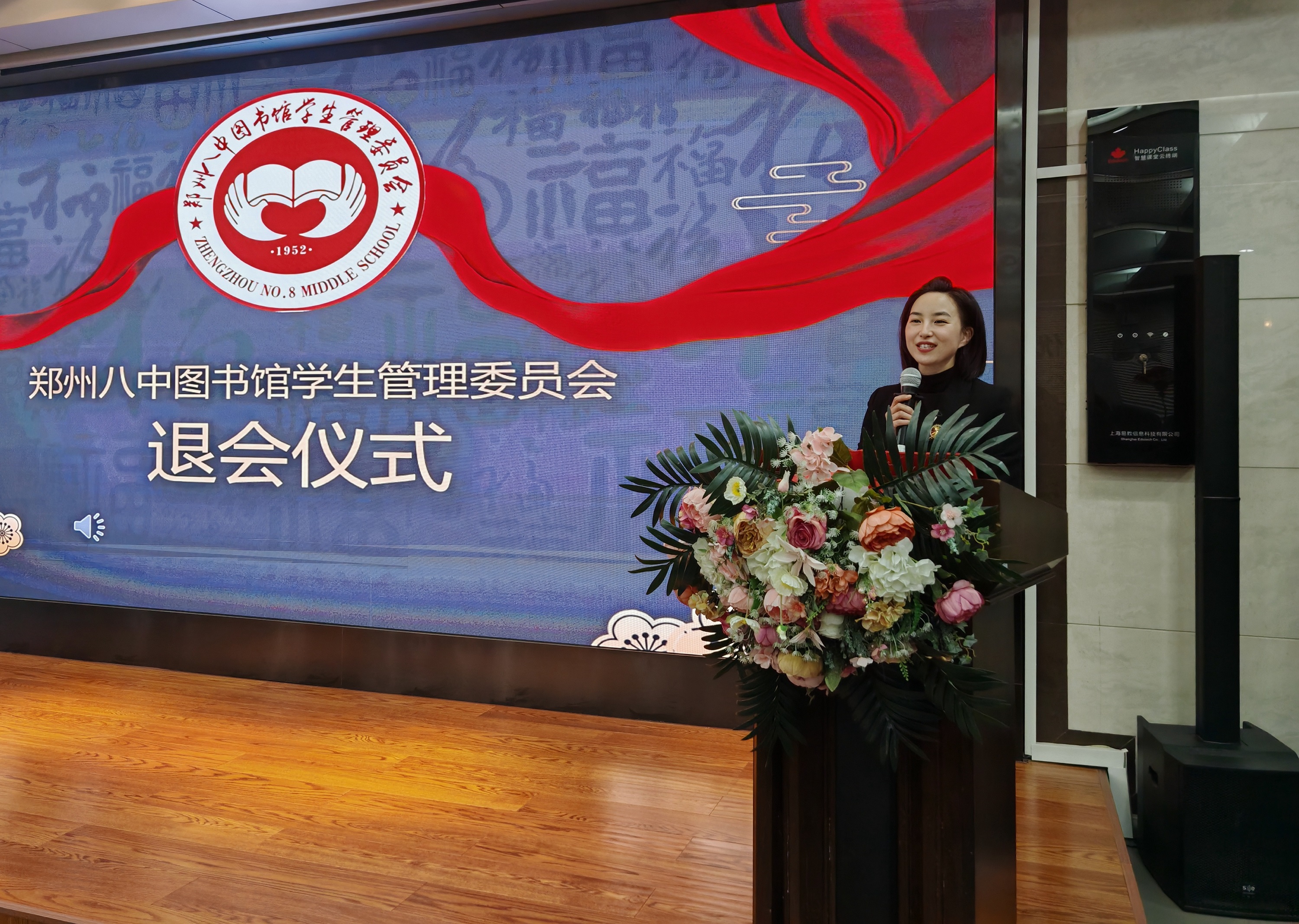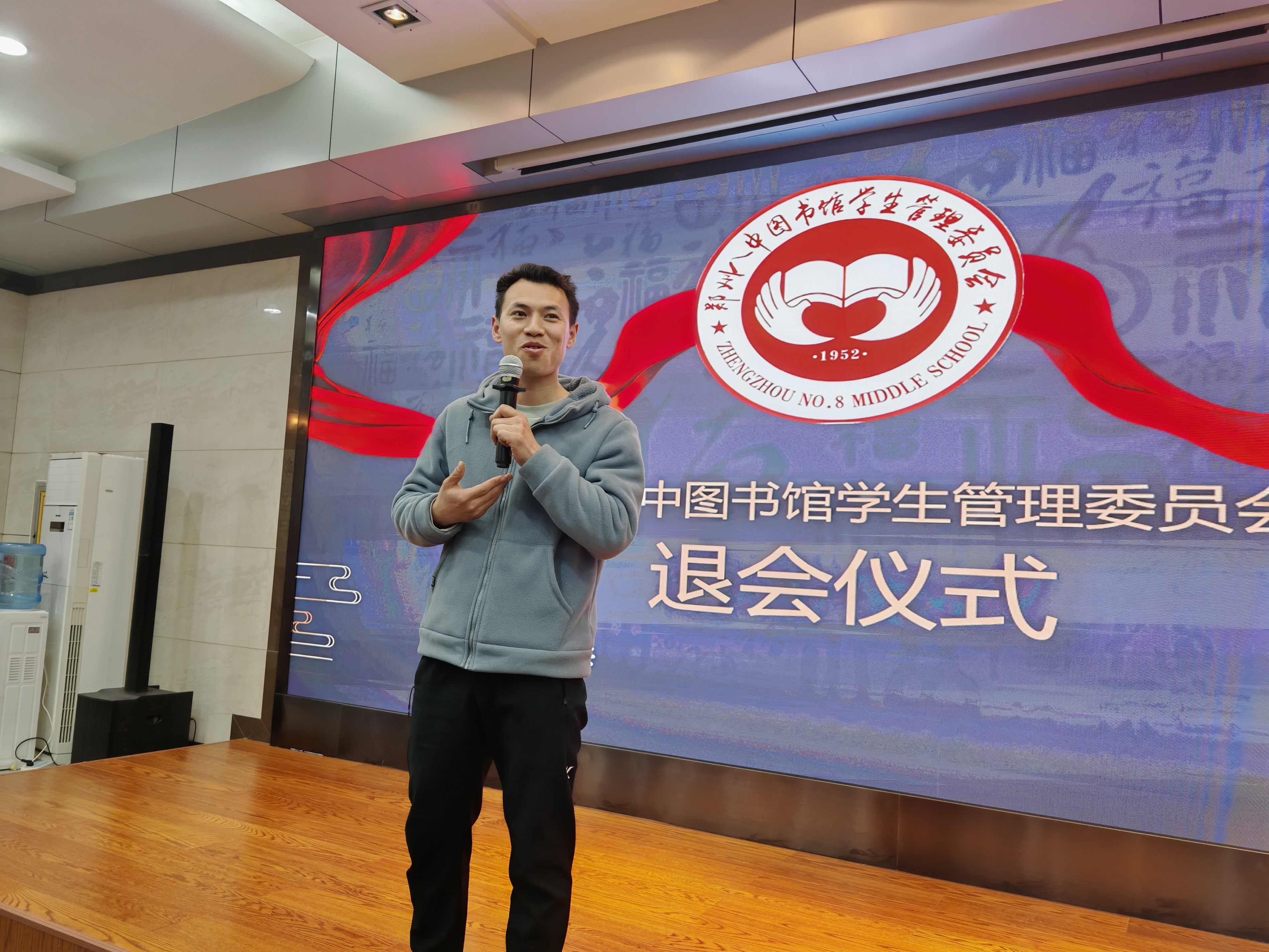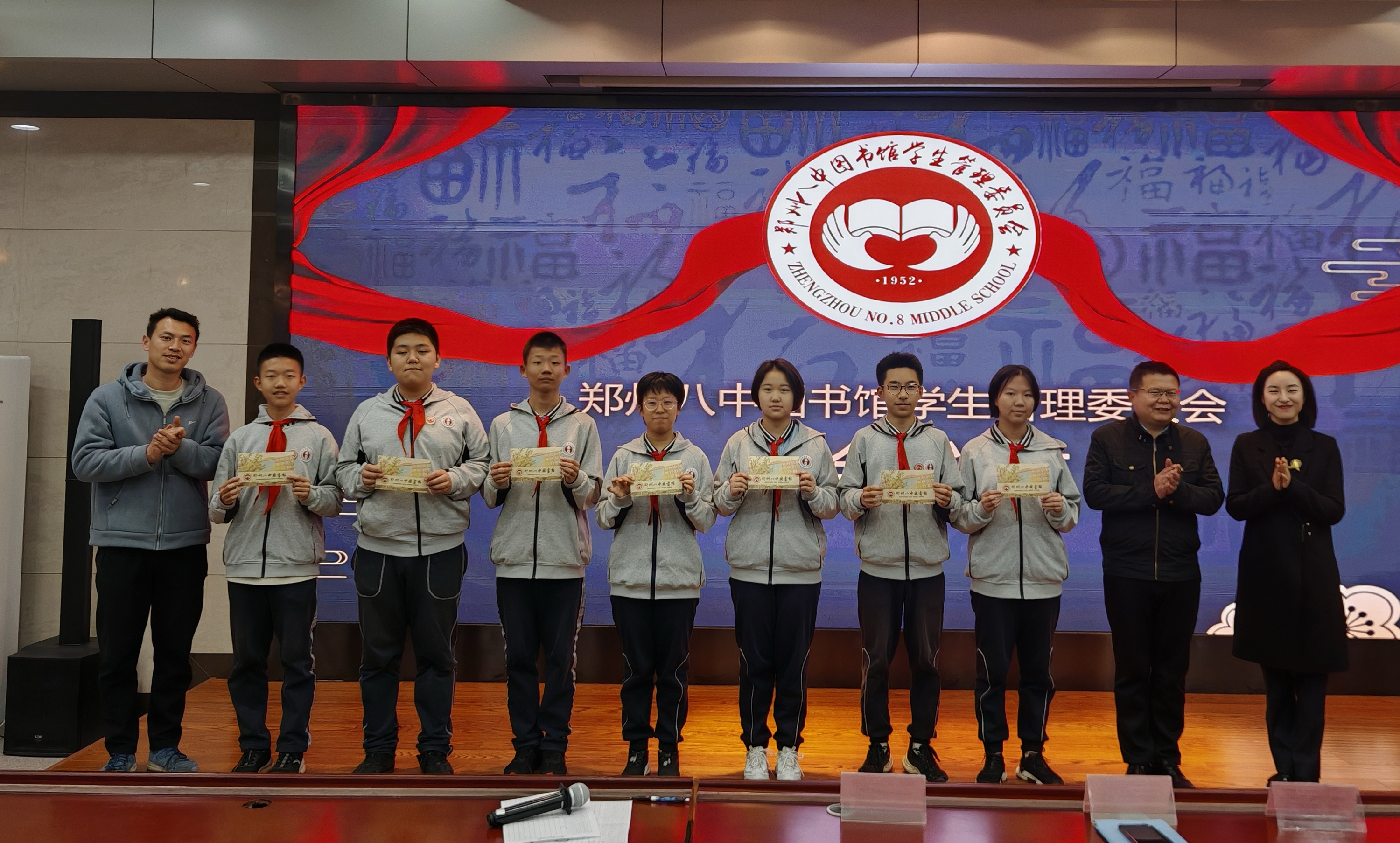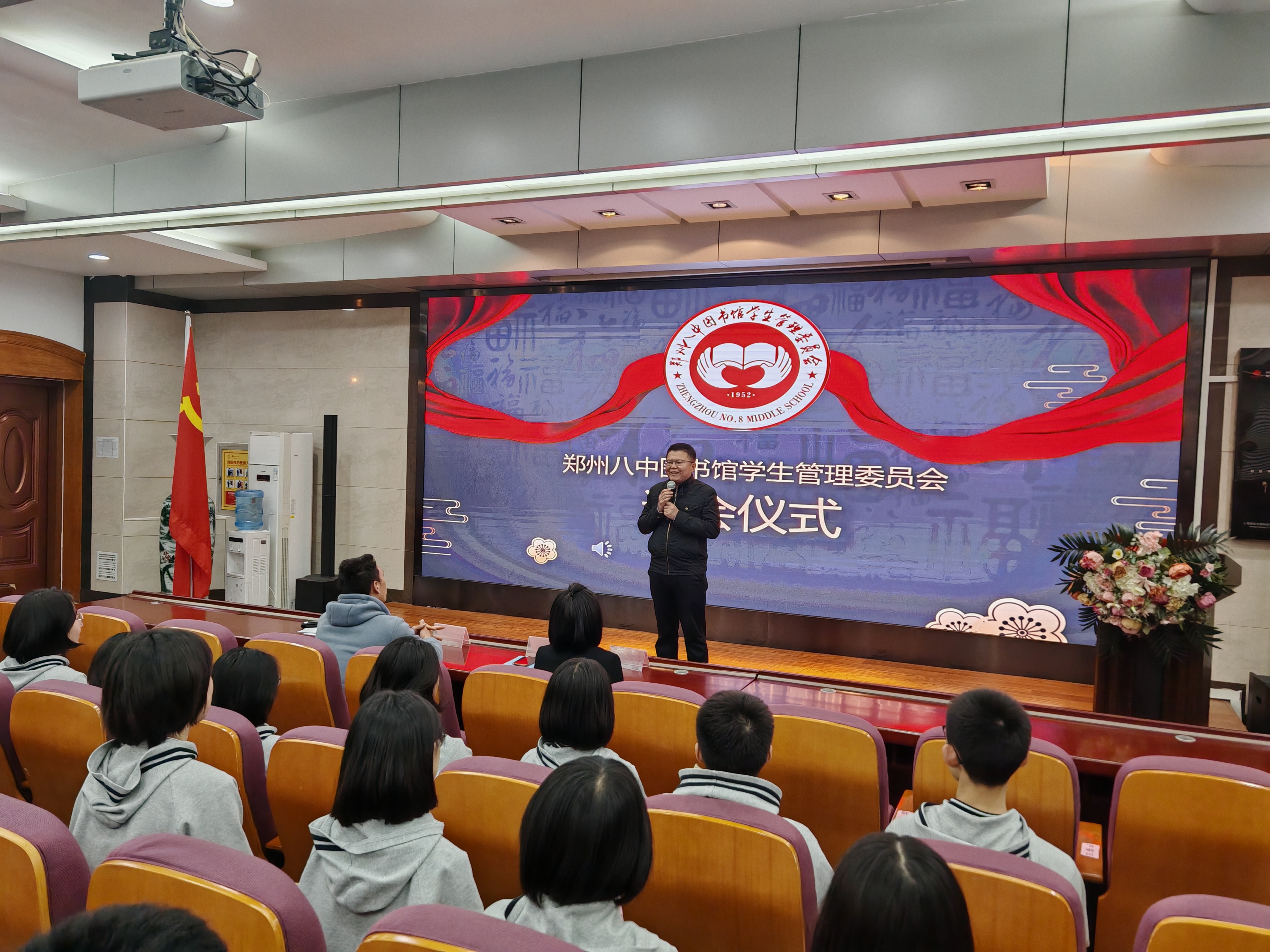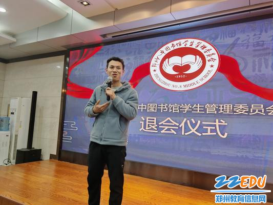 4月8日,郑州八中图书馆学生管理委员会(以下简称“图管会”)在郑州八中多功能报告厅举行2024届、2025届会员的退会仪式。在庄严肃穆的国歌声中,58名即将退会的会员感受到学弟学妹们的深情祝福,同时也收到来自学校政教处、团委以及图管会指导老师的高度评价和美好祝愿。
