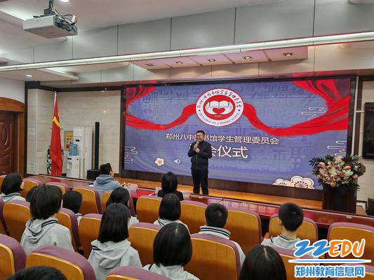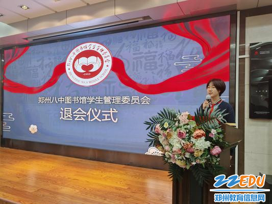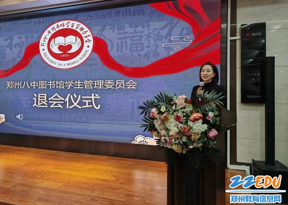 郑州八中政教处主任甘铁权、团委书记黄晓杰以及图管会指导老师王瑞芳分别发言。甘铁权对图管会过往的工作给予充分肯定,对会员们取得的成绩表示赞赏。黄晓杰对新一届会员提出新的要求和期待,希望他们能够继往开来,让图管会继续在校园内发挥重要作用。王瑞芳老师则对退会的会员们表达深深的感谢和美好的祝愿,希望他们在未来的道路上春光灿烂、书香永随。