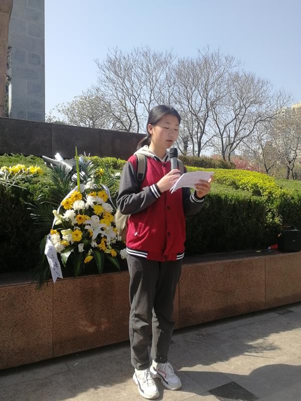 随后,同学们聚集在北伐阵亡将士纪念碑前,向周围游园的市民们进行宣传,吸引他们加入到祭扫仪式,顷刻间聚集三十余人。在嘹亮的国歌声中,祭扫活动正式开始。于卓雅同学致悼词,社团成员及市民们手拿鲜花,依次向纪念碑鞠躬、现花,表达了对革命先辈的敬意与缅怀。最后在郑昱斌同学带领下,同学们面对纪念碑庄重宣誓:“以我壮志激情,创造崭新未来,以我火红青春,建设锦绣中华。”
