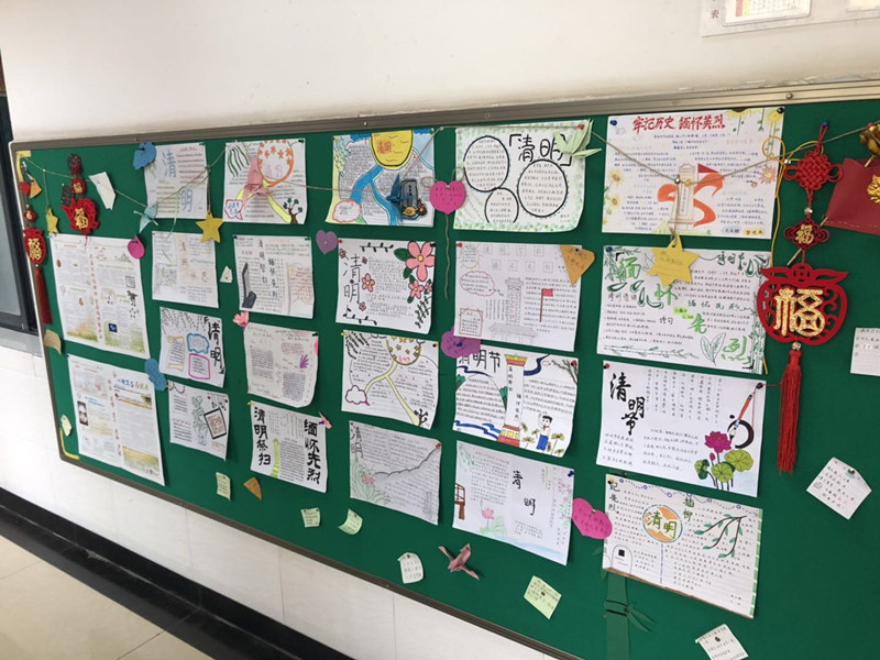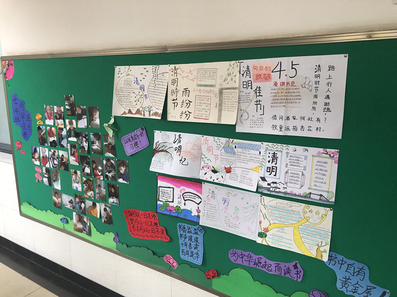 4月1日上午,七年级各班首先是以“我们的节日——清明节”为主题上了一节特别的语文课。先由各班语文老师向孩子们简单介绍了清明节的来历,接着讲述刘胡兰、杨靖宇、董存瑞、黄继光等革命烈士的事迹,从而引导学生继承先烈遗志、珍惜幸福生活、立志报效祖国,最后让学生讲述心中的英雄,畅谈自己的理想。同时,在郑州45中团委的组织下,七年级语文组利用周末时间给同学们布置了清明节主题手抄报评比活动,4月1日下午手抄报优秀成果展览在了各班的文化墙上。同学们在查询相关资料、参与设计的过程当中,知道了清明节的来历、习俗,学习了革命先烈的故事,也树立了立志成才的远大目标。