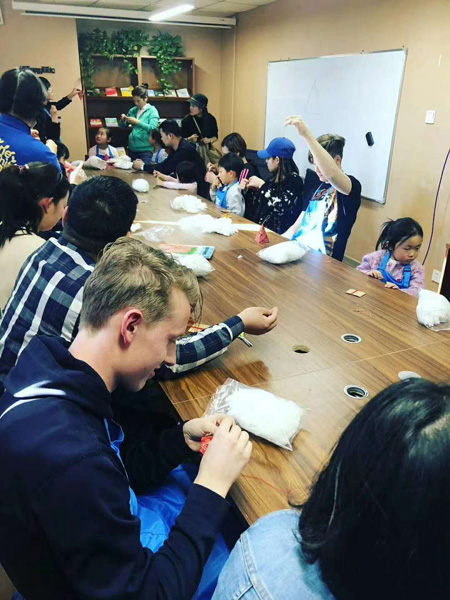 葫芦,有”福禄“的说法,在民间,人们都喜欢用谐音来表达对生活的期盼。孩子们尝试穿针引线制作了葫芦,这对男生来说更是一种挑战。尽管有些针脚不够细致,有的还脱线了,但每个人都很专注。参加活动的中国父母们也很耐心地和孩子们一起体验。