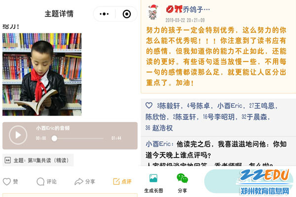 “米家共读”是一种亲子共读模式,需要家长的陪伴、孩子的坚持。参与的孩子们在统一的时间共同阅读同一本书,每晚半小时和家长一起在线打卡共读,分享自己朗读的风采;同时,有专业老师针对每个孩子共读的情况进行点评辅导。每周有“米家共读”专属的《阅读记录卡》和《阅读训练卡》,协助孩子们针对阅读过的内容进行小结。