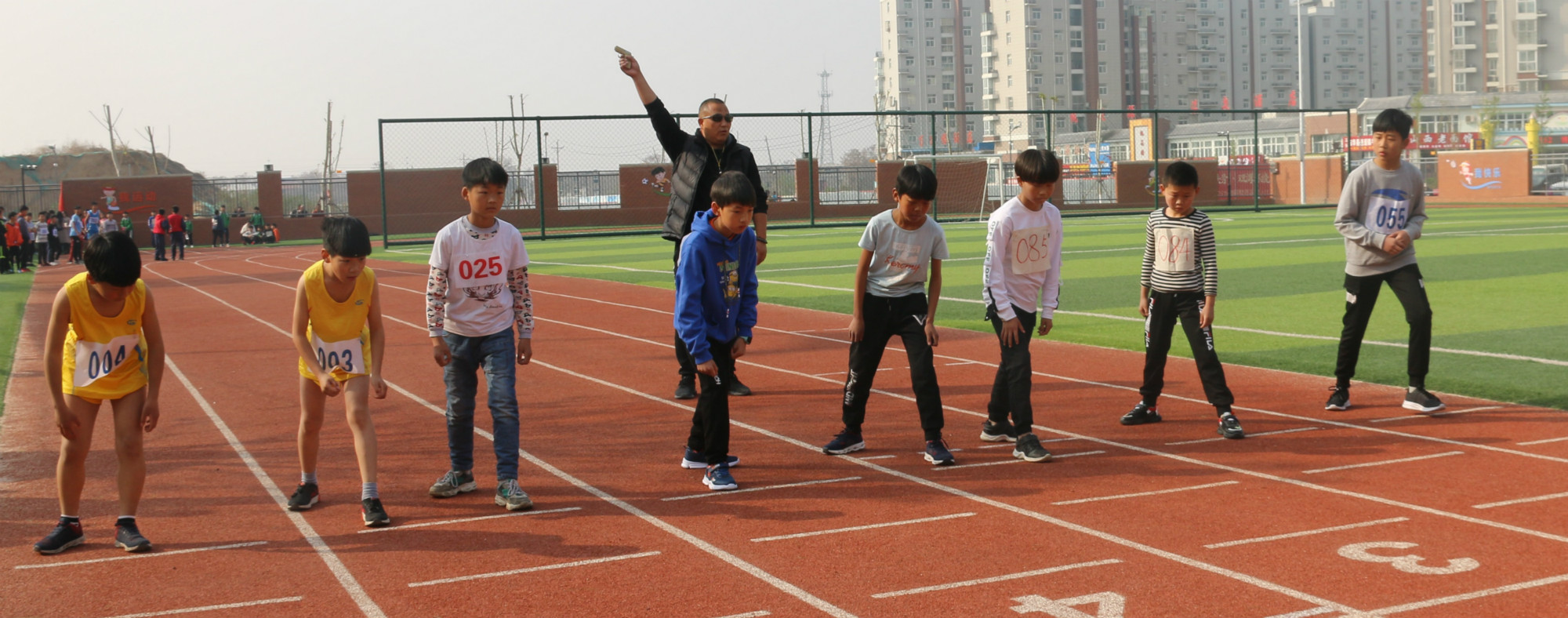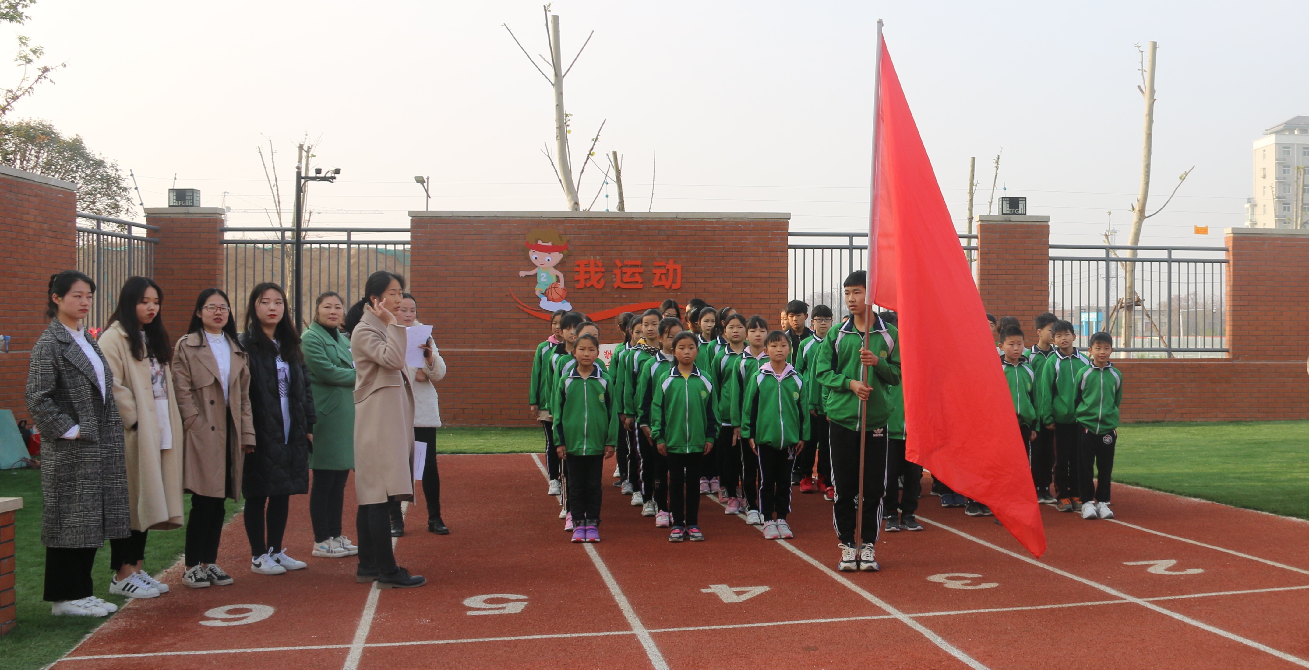 裁判组和五所学校的运动员全部进入运动场地