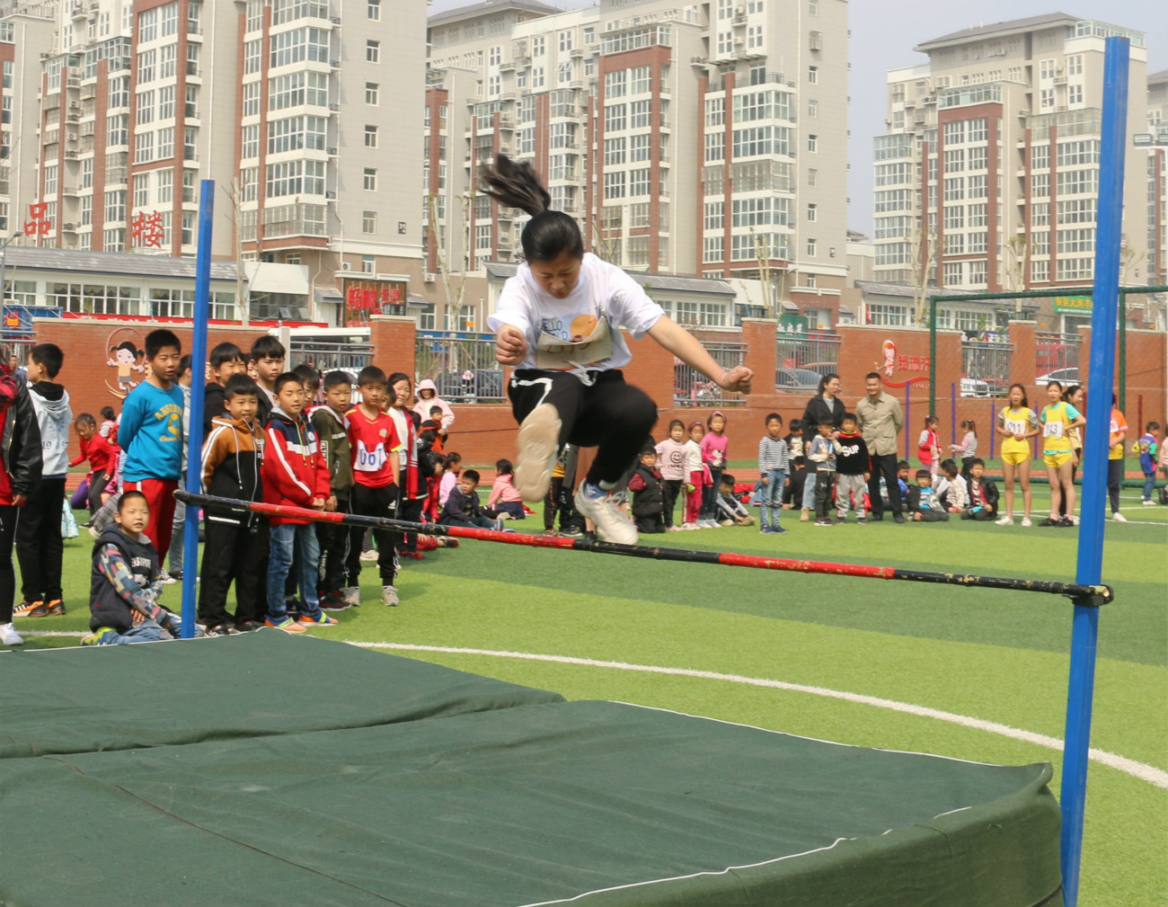 跳高比赛中,95号荥阳市广武镇第七小学的运动员王晓怡