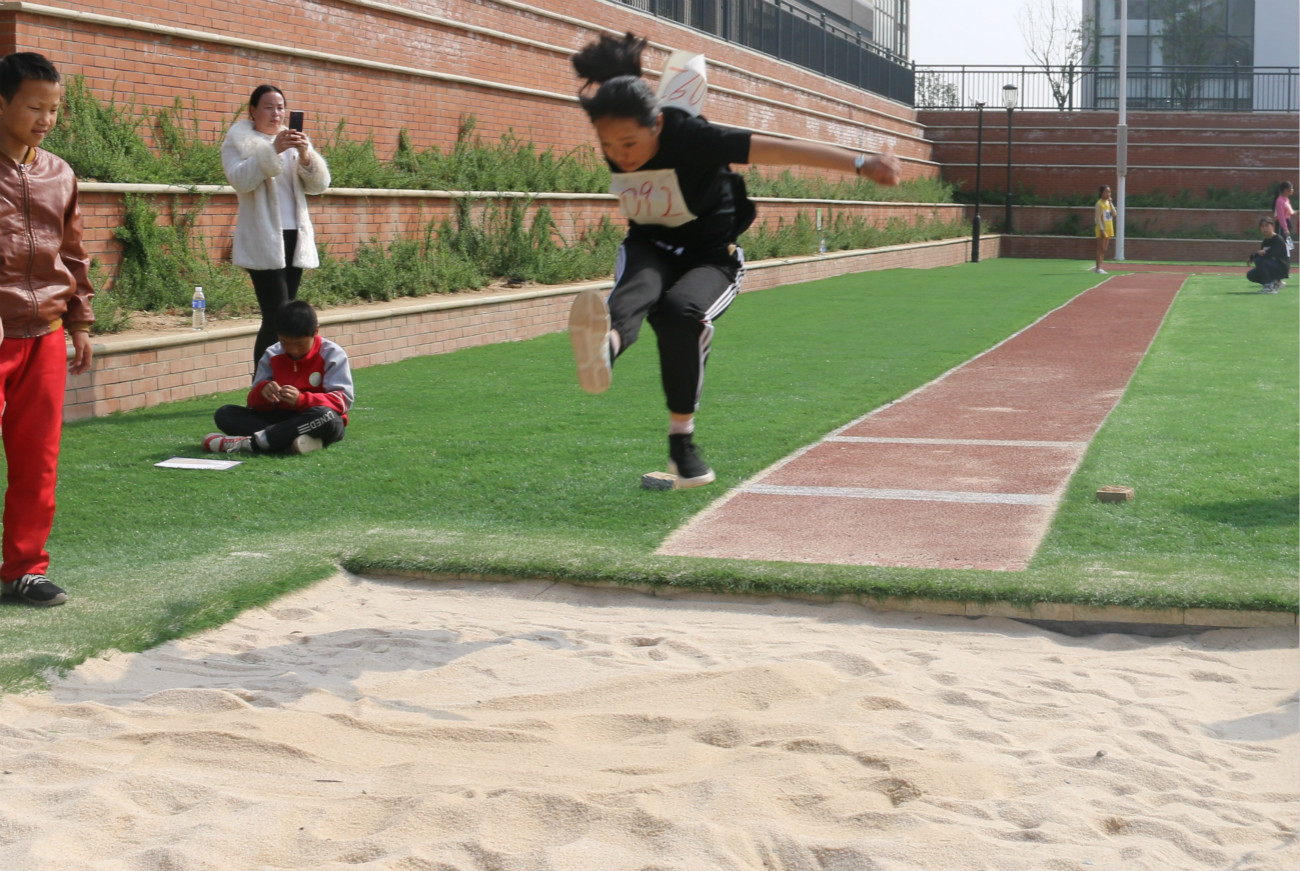 跳远比赛中,92号荥阳市广武镇第七小学的运动员王梓彤