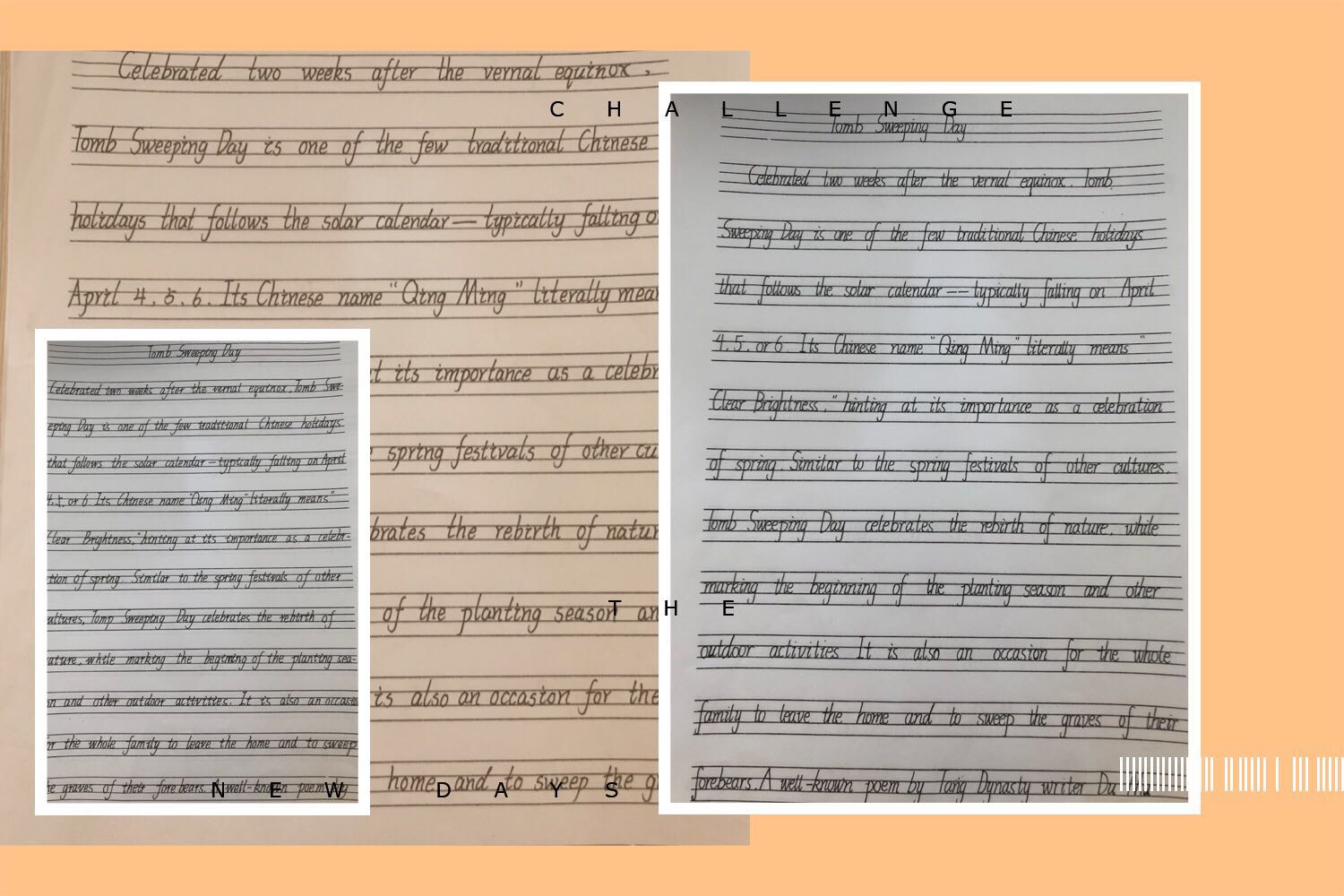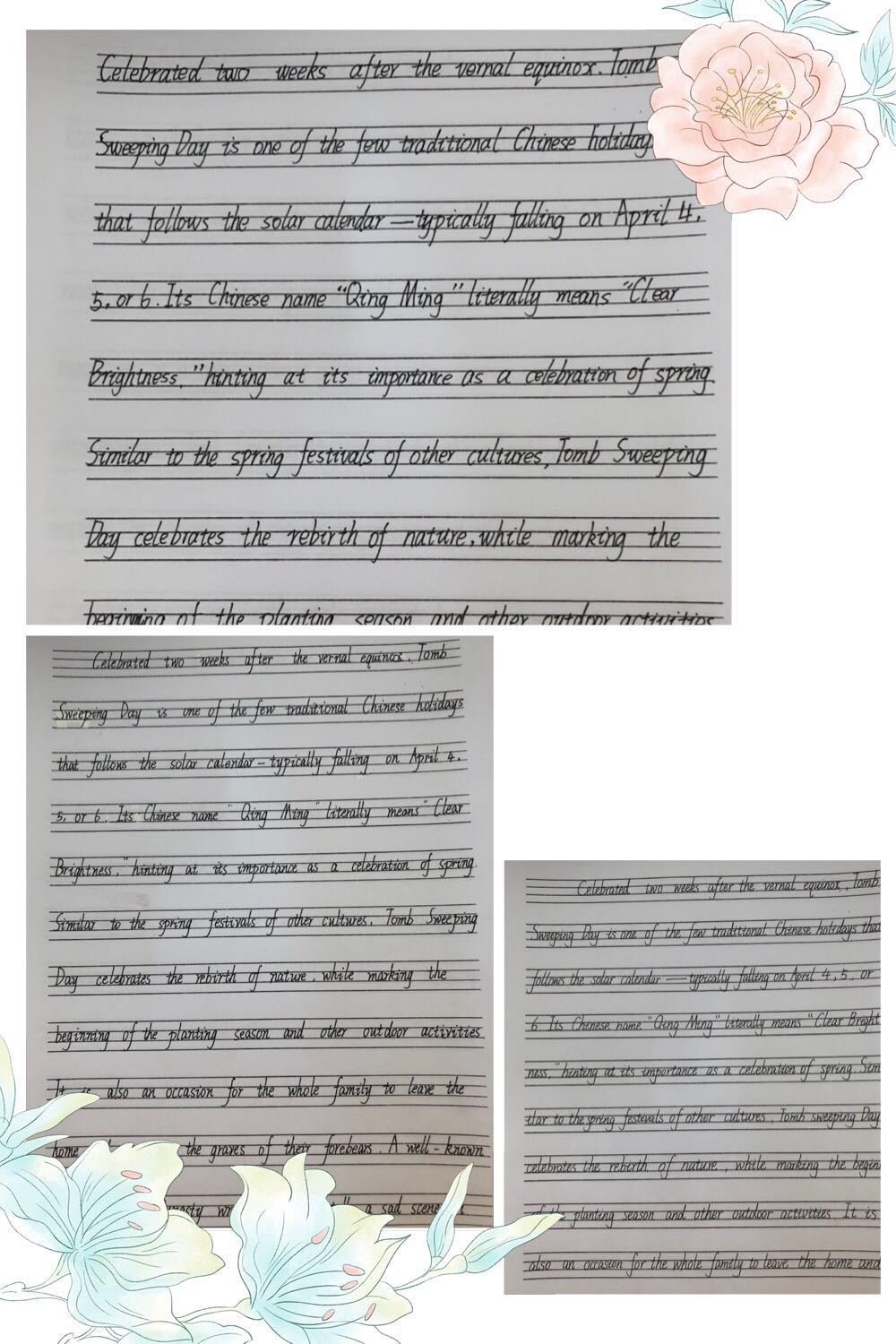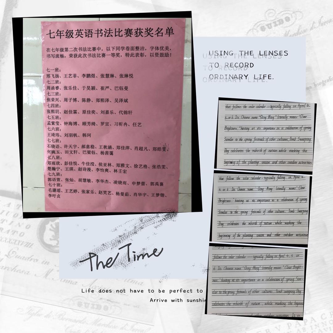 古语有云“心粗气浮,百事无成。书虽小道,亦须静定。”书写能养气,也能助气,对人各个方面都有一定的调节和锻炼作用,久而久之,可使人灵心焕发,沉心静气。4月15日下午,郑州二中七年级在英语组教师和语文组教师的共同组织下,举行了以“挥洒浪漫笔墨,书写靓丽青春”为主题的中英文硬笔书法比赛。