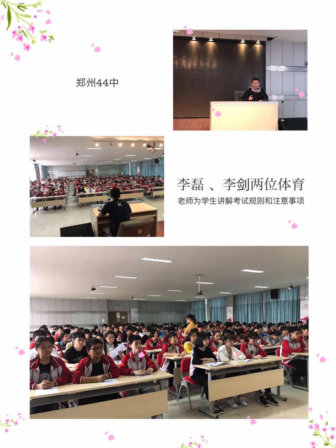 考试之前,郑州44中初三年级召开体育动员会,李磊、李剑两位体育老师为学生细心讲解考试规则及注意事项,动员会上郑州44中教学校长孙希勉励同学们:“没有比脚更长的道路,没有比人更高的山,你们人生中正在经历一次重要的挑战,或许你有激动,也有忐忑,但是不要忘记身边所有关爱你的人,我们是你坚强的后盾,所以,你们既要满怀激情又要沉着冷静,充分发挥实力,考出最满意的成绩!”