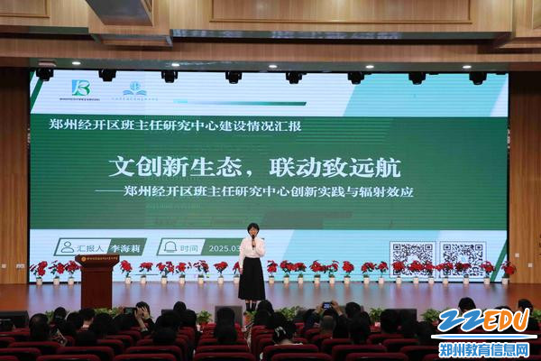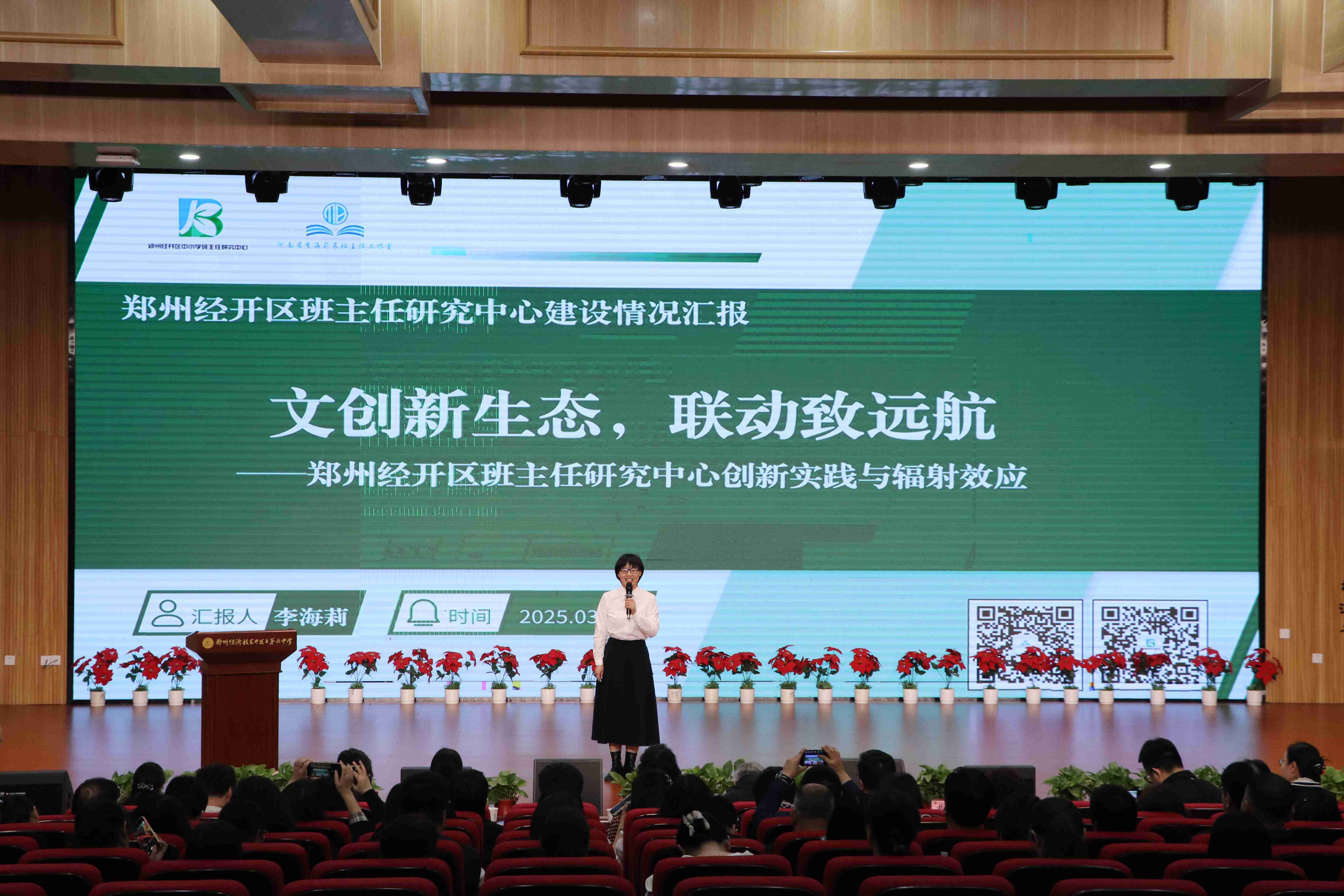 郑州经开区班主任研究中心秘书长李海莉做了题为《文创新生态,联动致远航——郑州经开区班主任研究中心创新实践与辐射效应》的主题报告。李海莉从郑州经开区班主任研究中心的创建背景与文化内涵谈起,全面阐述了研究中心的理论创新与机制构建、创新实践与具体路径,并向参会成员分享了研究中心的成果辐射,提出了团队建设与品牌打造的发展愿景。