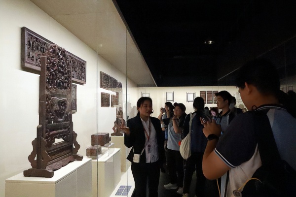 步入非洲木雕艺术馆,充满原始张力的200余件展品引发热烈讨论。讲解员通过《面具中的部族信仰》专题讲座,同学们惊奇地发现,原来影视作品阿凡达、奥特曼、哥斯拉都能在非洲木雕文化中找到原型。中华色彩博物馆的研学环节格外引人入胜。从敦煌壁画的矿物颜料到明清织锦的植物染样本,从"天玄地黄"的礼制色谱到《红楼梦》中的服饰色彩隐喻,学生们在惊叹中国"天水碧""暮山紫"等传统色的过程中,了解到中国传统色彩是以青、赤、黄、白、黑五正色为基础的,源自中国的五行学说。在明代家具博物馆内,黄花梨透雕靠背圈椅、紫檀夹头榫画案等珍品令师生流连。通过触摸“一木连做"的温润触感,学生们在《营造法式》的智慧中读懂"器以载道"的深意;通过亲眼所见课本中的明代书案,学生们更能深刻的理解高中美术课本中的“器物美学”。