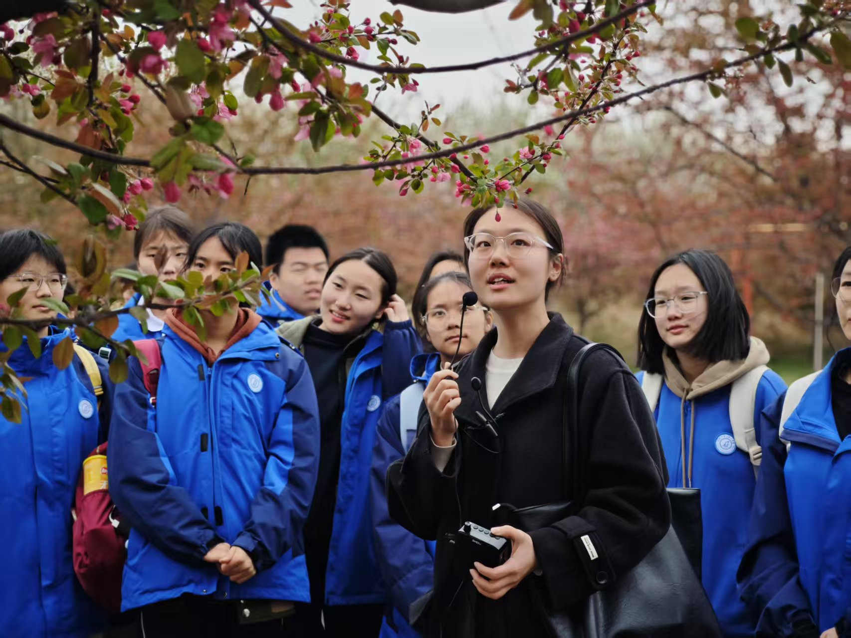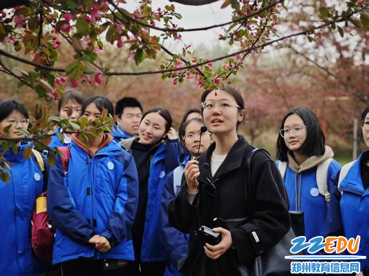 活动第一站选在荥阳汜水镇的新沟花海。春日的花海中,海棠花竞相开放,美不胜收。学生们漫步其中,近距离观赏了海棠花的美丽姿态。郑州市第一〇一中学生物组老师郭飞宇则从植物学分类入手,为学生们讲解了海棠的基本特征,蔷薇科的海棠茎上常有刺及明显的皮孔,互生叶序,两性花。不同种的海棠特征不同,如西府海棠的花梗呈绿色,花朵呈粉白色;垂丝海棠的花梗细弱下垂呈红色,花朵颜色更为鲜艳等。通过老师的讲解,学生们对海棠花有了更加深刻的了解。