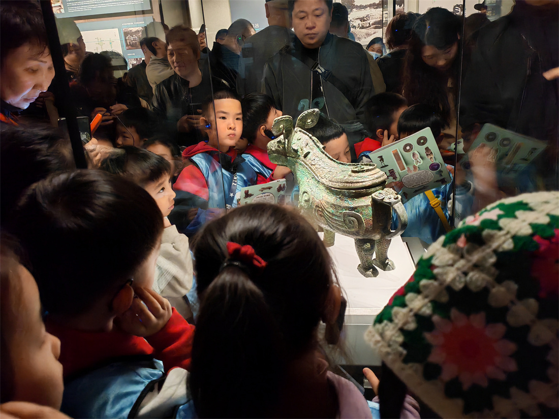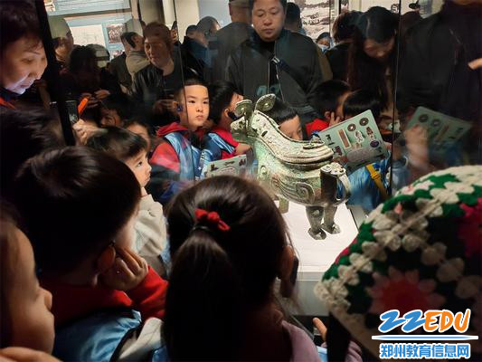 随后,孩子们怀揣着满心期待,迎来了近距离观赏镇馆之宝的“高光时刻”。讲解员姐姐引领着孩子们穿梭于各个展厅的岁月长河之中。每驻足在一件镇馆之宝前,讲解员姐姐便绘声绘色地开启讲述,从古老繁复、令人称奇的制作工艺,到先辈们的无穷智慧,桩桩件件,毫无遗漏。孩子们个个仰着稚嫩的脸庞,眼睛如同圆溜溜的铜铃,满是好奇地打量着眼前的文物。每一件文物,它们都是历史忠实的见证者,承载着河南大地数千年波澜壮阔的文化传承,如同一只无形的手轻轻推动历史的画卷,悄然打开了华夏文化的知识大门。