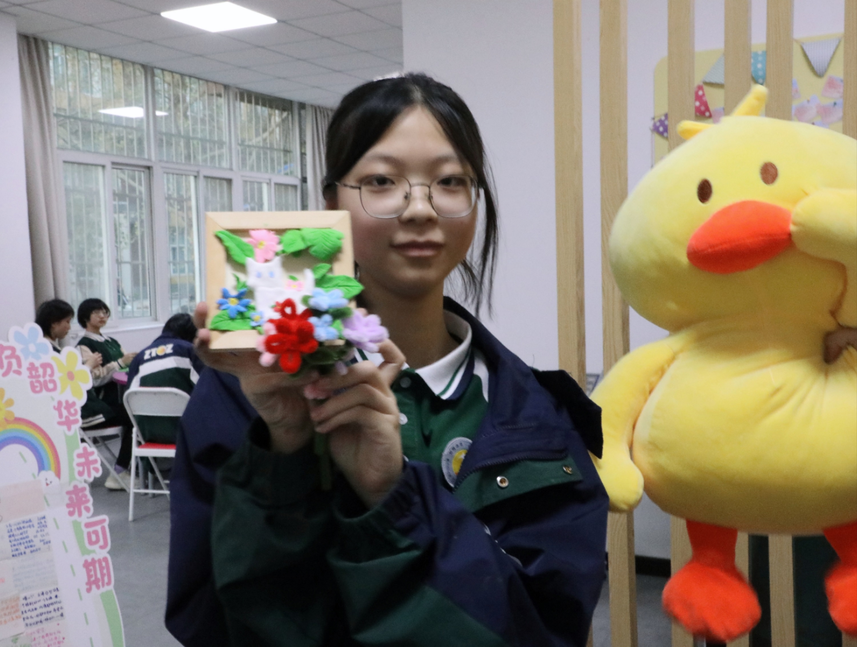 本活动通过“自然疗愈+艺术表达+五感寻宝”的创新环节,将学校美术特色与心理特色深度融合,包括春日手工感受春天、春日笑脸留住春天和五感体验春日寻宝三个活动项目,吸引了数百名同学积极参与。有的同学选择了春日手工项目。大家巧妙运用超轻粘土和扭扭棒,创造出一朵朵美丽的花朵,一株株可爱的小绿植,一件件好玩有趣的扭扭棒发卡。有的同学选择了春日笑脸主题。参与者或独自构思,或与好友协作,用彩色画笔在笑脸墙上挥洒创意。笑脸墙上记录了各种灿烂的笑脸和调皮的鬼脸,蕴含着青春的活力;有的同学选择了五感寻宝主题。本活动调动同学们的视觉、听觉、嗅觉、触觉、味觉完成寻宝活动单的任务。有的同学被春日的绿叶和小花吸引,有的同学被校园里面毛茸茸的小猫治愈。