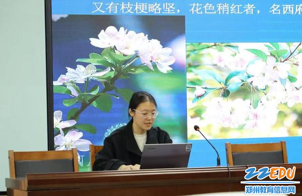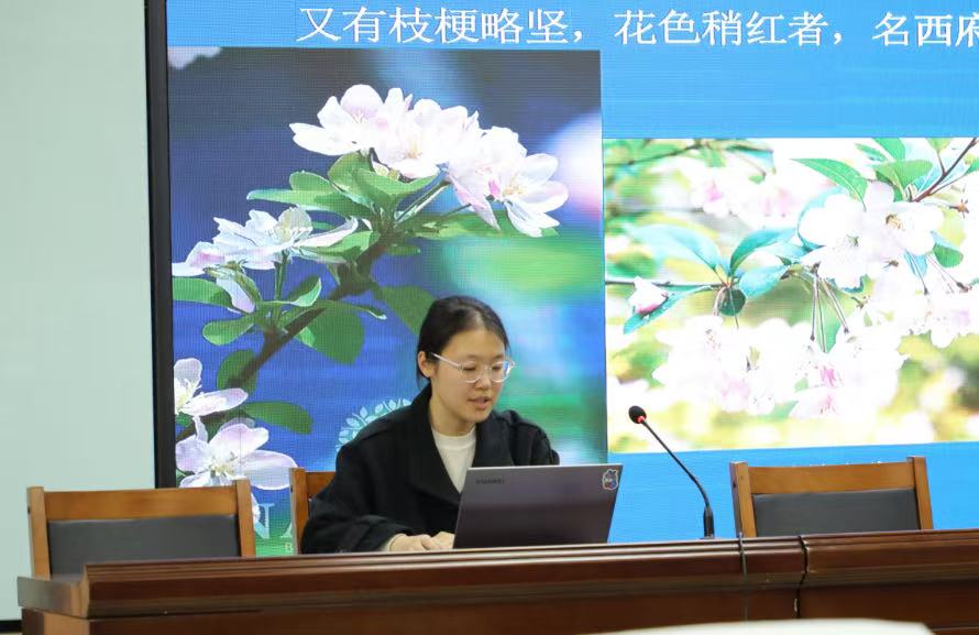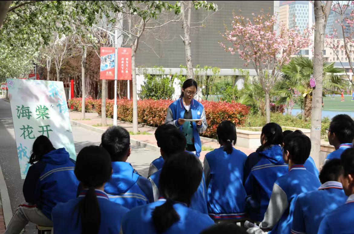 活动伊始,生物组教师高静静带领学生在海棠树下开展“植物观察课”,从海棠的形态特征、生长习性,将自然课堂延伸至春日花海之中。随后,在报告厅举行的专题讲座中,郭飞宇老师以《海棠的植物密码》为主题,通过讲解海棠花的花形、叶形、叶序生长周期等内容为同学们系统讲解了有关海棠花的生物知识。