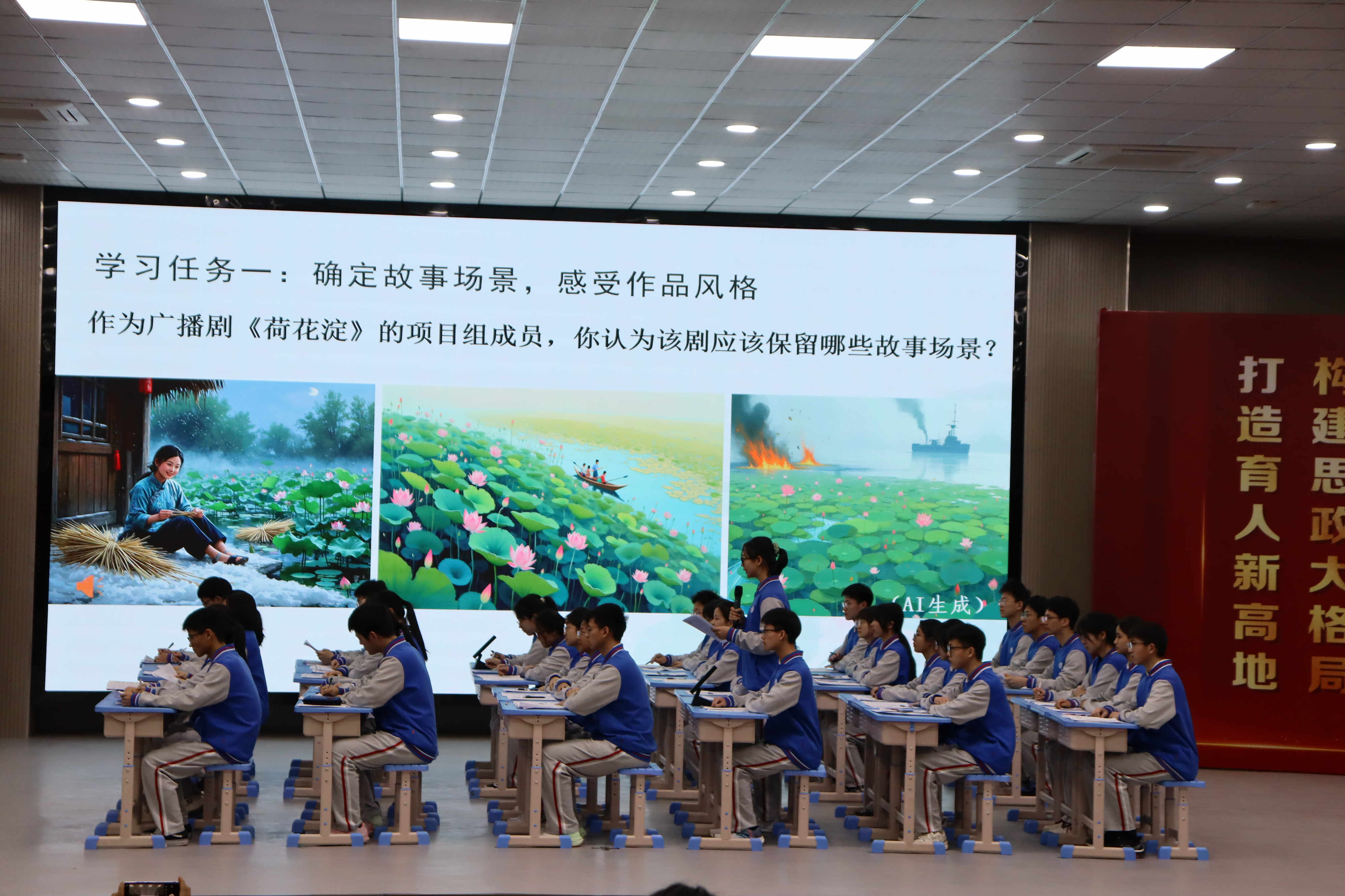 展示课上,杨威然巧妙地以郑州市第一〇一中学“红色文学地图”项目组的项目实施为大情境,让同学们完成广播剧《荷花淀》的制作,进而点亮红色文学地图,传播红色经典,传承革命精神。巧妙的设计,极大地激发了同学们参与课堂的兴趣。接着,杨威然以广播剧《荷花淀》的制作任务为驱动,引导学生在故事场景确定中感受作品风格,在声展片段制作中认识典型形象,在广播脚本演读中勾勒人物群像,在推广简语选取中体悟抗战精神。同学们从文本中的英雄群体汲取力量,让红色基因深入人心。整个过程中,同学们真正成为课堂的主人,在活跃的课堂气氛中提升能力、启迪心智,培养了爱国情怀。在备课准备期间,语文教研组发挥团队力量备课研课,郑州市基础教育教学研究室语文教研员朱建军、余昆仑到学校听课指导,确保课堂最后的精彩呈现。展示课得到了与会领导和老师们的一致好评。
