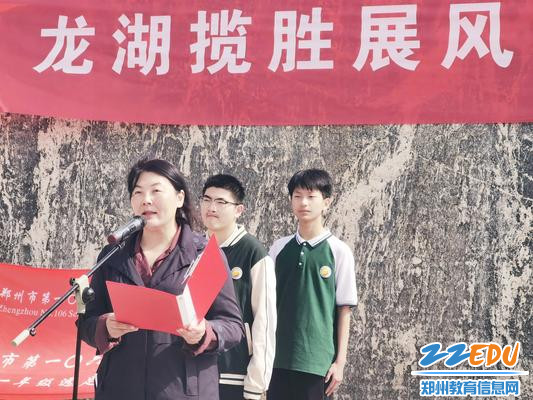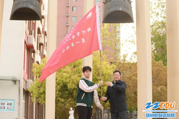 郑州市第一〇六高级中学校长胡庆周为学生代表授旗