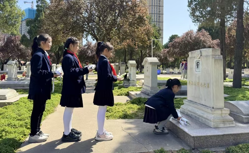 在烈士陵园中央广场,祭扫仪式庄重开启。全体师生肃立在革命先烈纪念碑前,师生们共唱国歌。少先队员缓步敬献花篮,全场师生低头默哀一分钟,春日阳光洒在纪念碑上,映出孩子们眼眶的泪光,这一分钟如此漫长,仿佛看见课本里的英雄们真的站在面前。默哀结束,学生代表发言,表达对革命先烈的敬仰之情和继承先烈遗志的决心。在宣誓环节,少先队员们高举右拳宣誓:继承先烈遗志,热爱祖国,勤奋学习……誓言声响彻陵园。