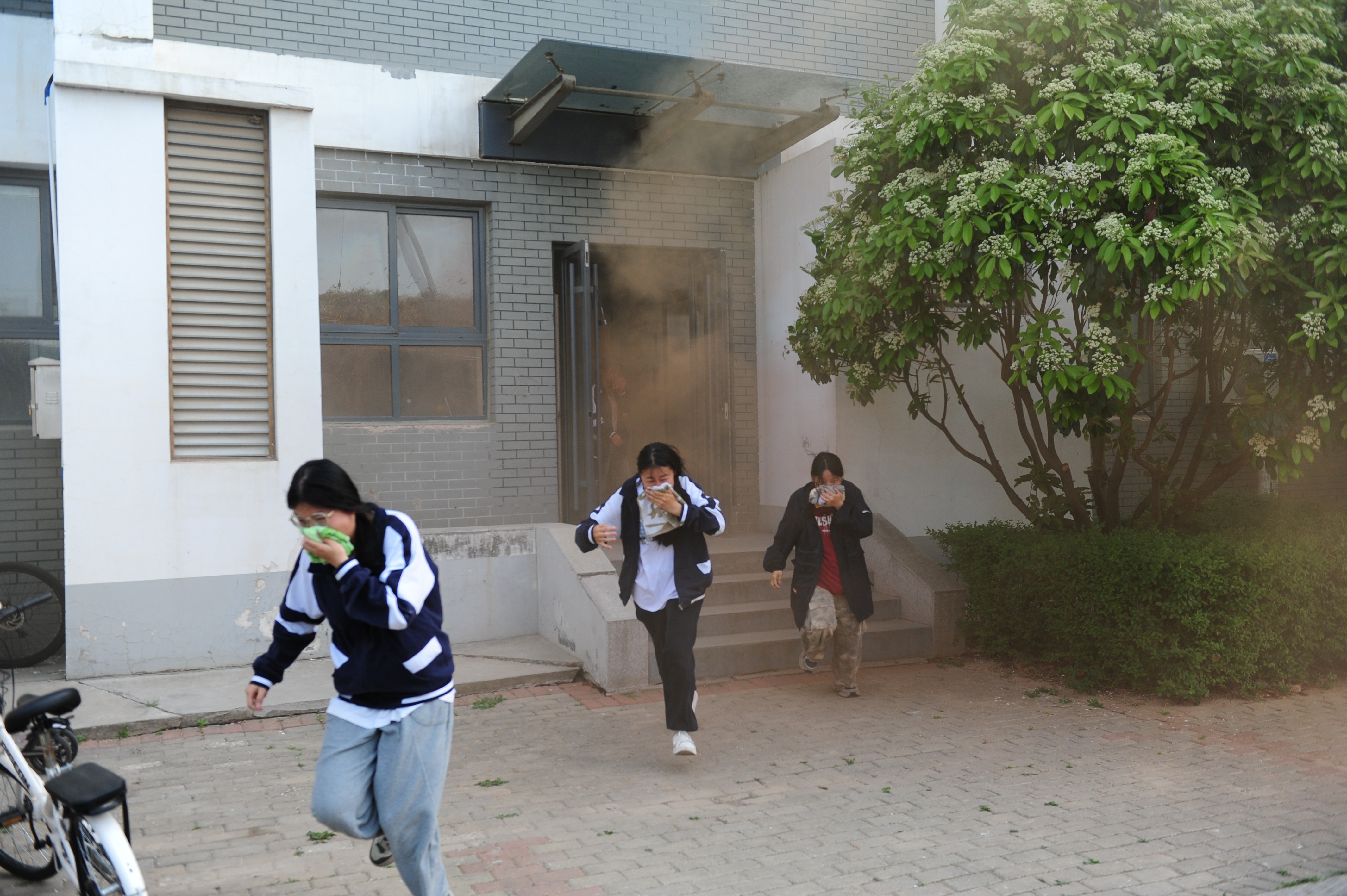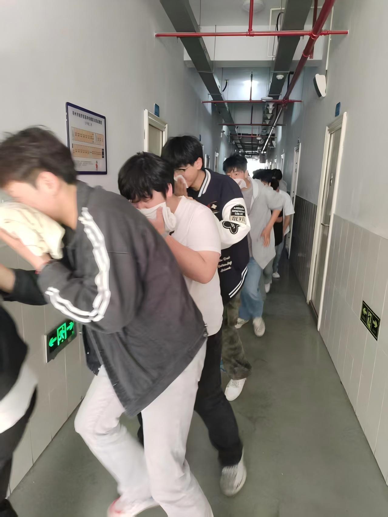 上午9时整,警报响起后,各楼层教官迅速就位,引导学生用湿毛巾捂住口鼻,沿指示灯的疏散路线弯腰前行。宿舍教官同步切断非必要电源,携带微型消防站装备赶赴“火场”待命。全体人员分批次通过消防通道,最终在操场集结点完成全员清点,全程未发生拥挤、踩踏等次生风险。