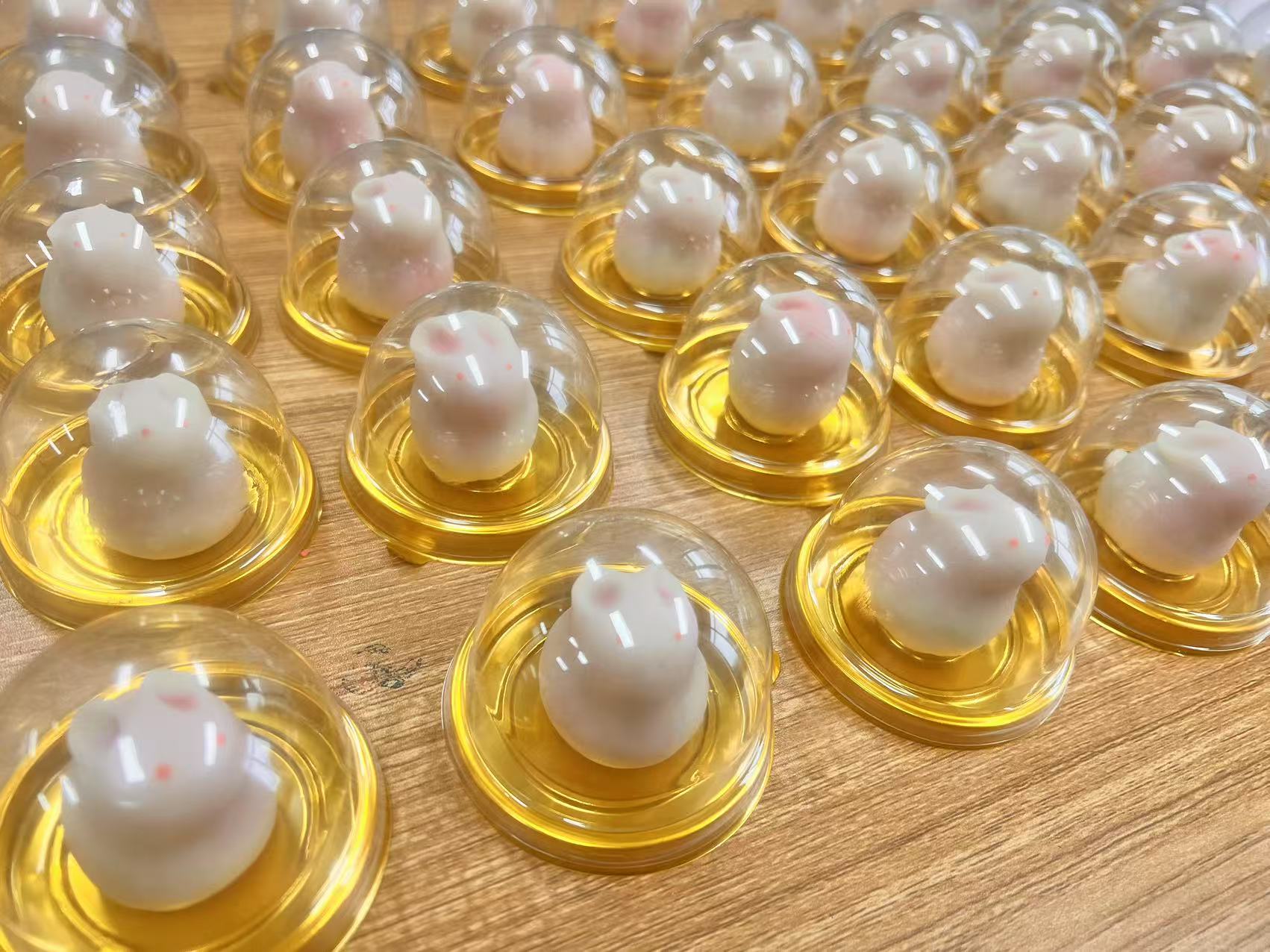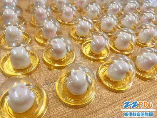 正当班主任们沉浸在艺术创作的喜悦中时,陈扬端出一盘盘造型别致的兔子茶果子,瞬间让现场气氛升温。这些茶果子以传统果子工艺为基底,糯米粉揉制的兔身洁白如玉,填以咸蛋黄肉松馅,再用食用色素点染出灵动的红眼睛与粉腮,每一只都萌态可掬。兔子象征着温柔与守护,就像班主任们对学生无微不至的关怀。接过这份特别的心意,班主任们既惊喜又感动。