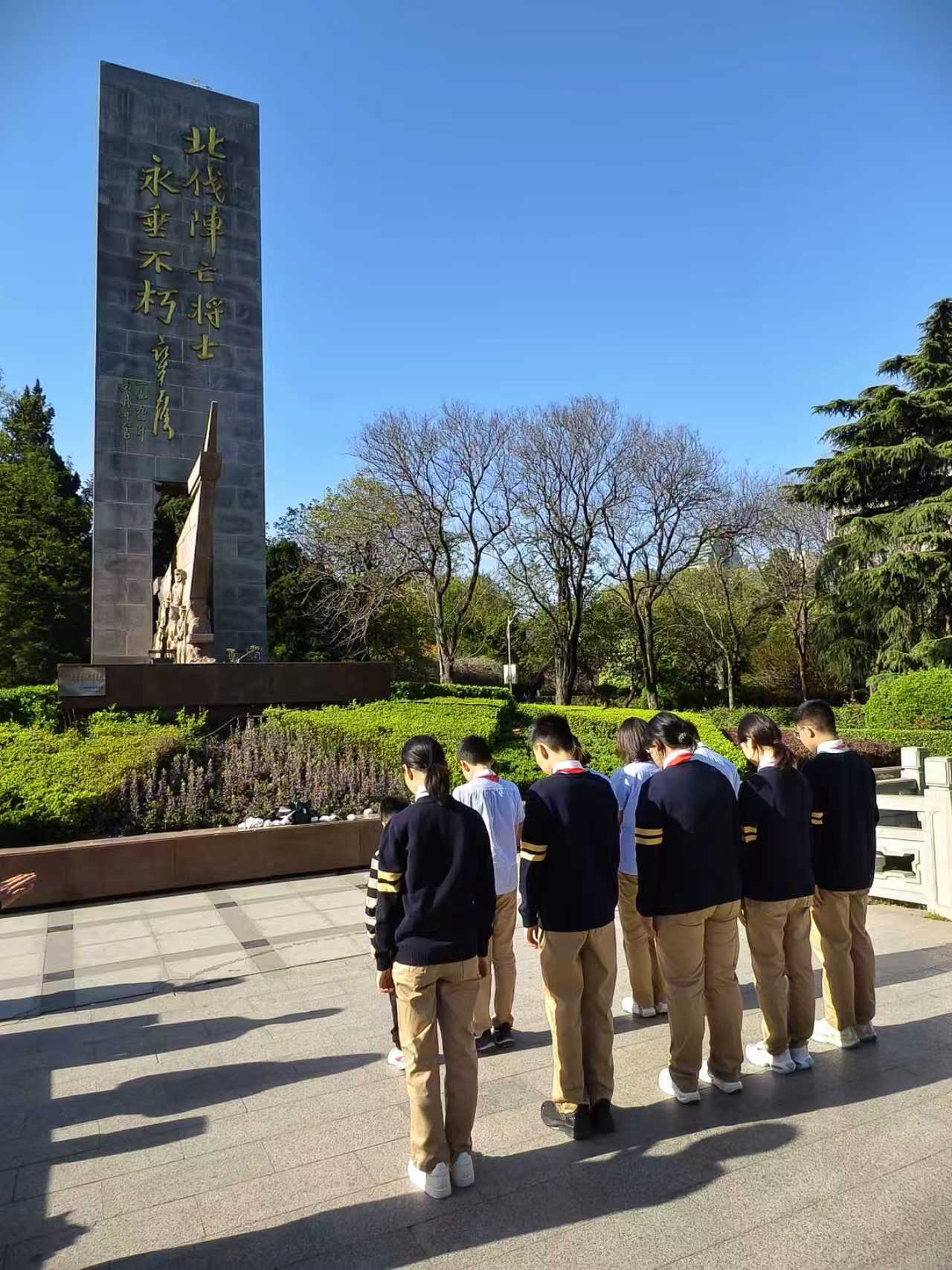 活动当天,师生代表身着整齐校服,神情肃穆,列队有序进入碧沙岗公园。在北伐烈士纪念碑前,全体队员整齐列队,举行庄严的祭奠仪式。伴随着低沉肃穆的氛围,全体人员向革命先烈默哀,深深三鞠躬,以此寄托对革命先烈的无限哀思与崇高敬意。随后,队员们依次上前,将手中洁白的鲜花敬献在纪念碑前,朵朵白花承载着对先烈的深切缅怀,诉说着新时代少年对英雄的无限追思。