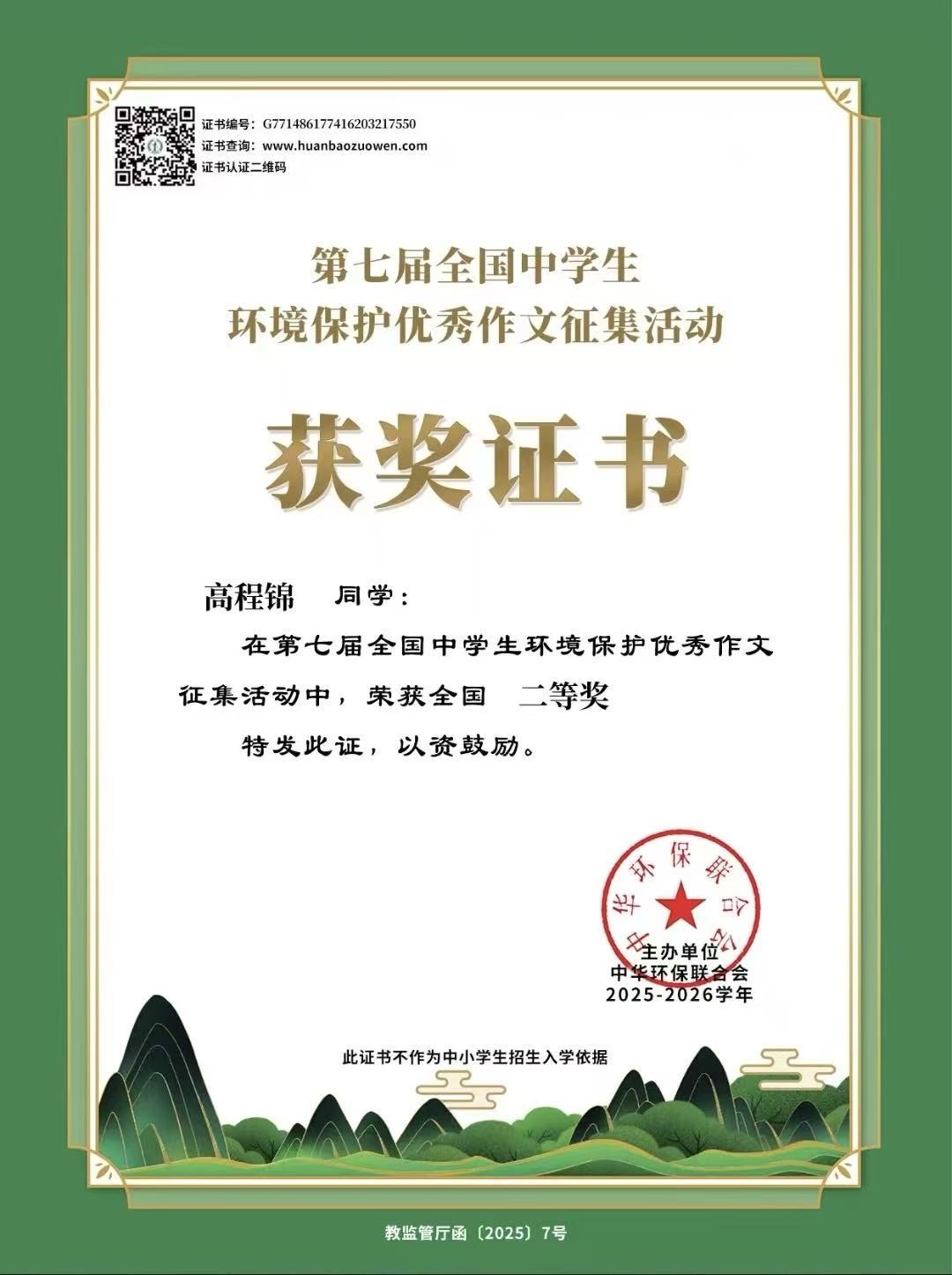本次大赛由中华环保联合会主办,紧扣“美丽中国,双碳有我”主题,是教育部认定的全国性白名单竞赛。大赛分初赛、复赛、决赛三级评审,作品涵盖环保作文与环保研究性学习报告两类,要求兼具思想深度与文字表达,竞争异常激烈。郑州市第十八中学语文教研组高度重视此次大赛,将其作为提升学生语文核心素养、落实“五育融合”的重要实践载体。郑州市第十八中学学生凭借扎实的文字功底与深刻的生态思考脱颖而出。39项省级奖项、12项国家级奖项背后,是学生们对“绿水青山就是金山银山”理念的生动诠释,既有对家乡生态变迁的细腻描摹,也有对双碳目标、绿色发展的理性探究;见证了学生们在语言表达、议论文写作等方面的扎实功底,体现了学校语文教学的精准发力与育人实效。