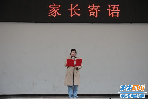 学生乔偲玙的家长作为家长代表登台发言,表达对同学们的爱与期许,承诺给予全方位的温暖支撑,做同学们最坚实的后盾,叮嘱同学们稳住心态,正视得失,相信自己,紧跟老师的指导,努力拼搏,创造灿烂的人生。