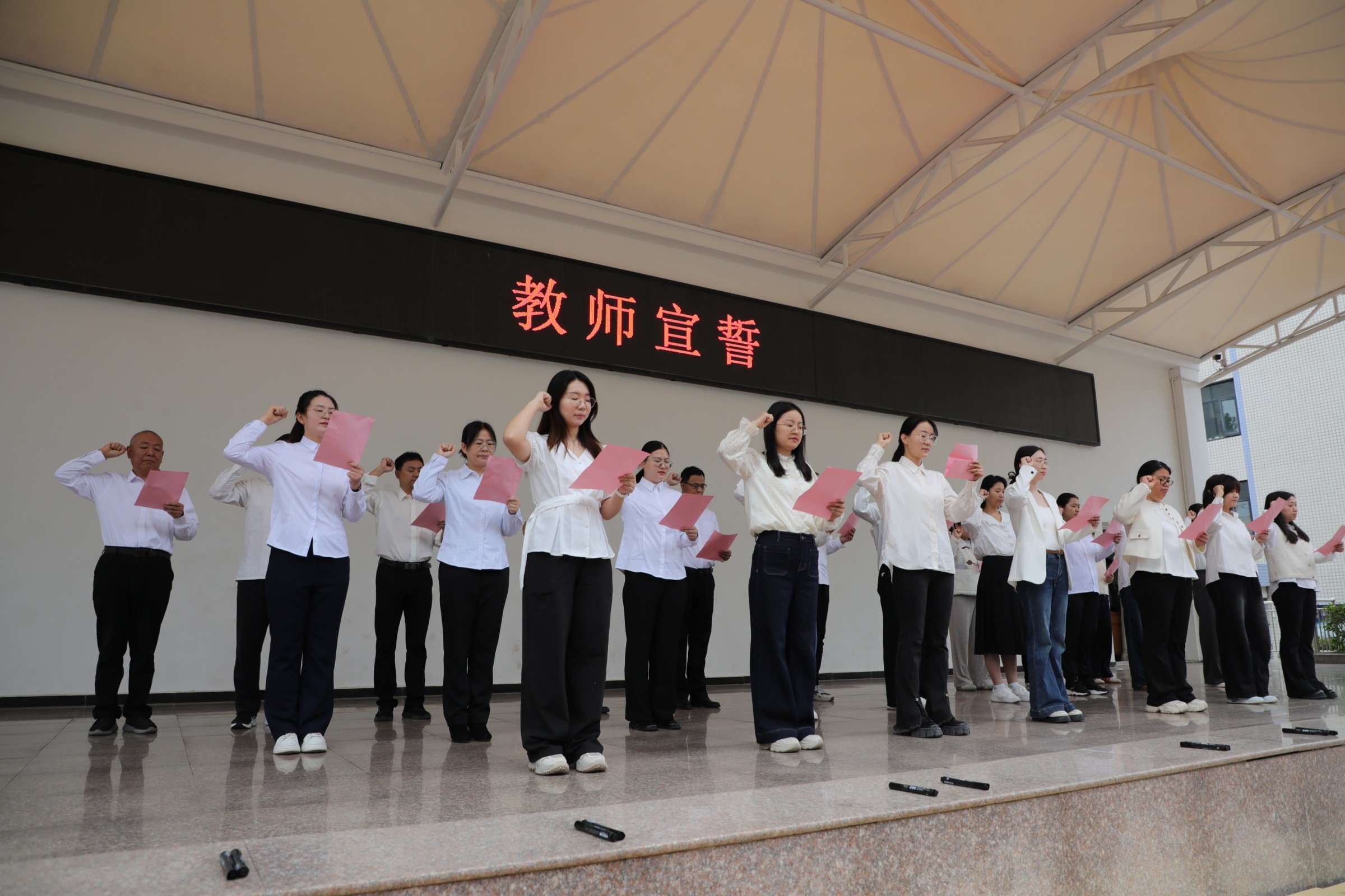 在高三年级长杨鹏飞的带领下,全体高三教师登台宣誓:“用心守护每一位学生,精心准备每一份教案,细心挑选每一道试题,认真批改每一份作业......”表达履职尽责、关爱学生、为学生逐梦成长保驾护航的决心。