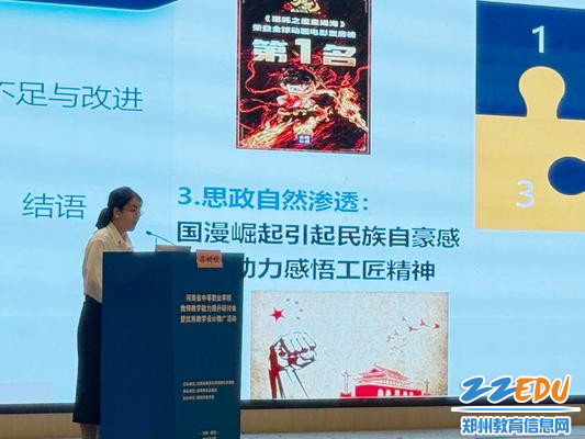 在优秀教学设计展示推广环节中,吕树欣老师登台说课,以《国漫崛起,文化复利——指数函数》为题进行分享。她以国漫崛起为切入,将“指数增长”的数学知识与“文化复利”的专业意象结合,通过教材分析、教学策略、教学过程和教学反思四个过程进行说课展示。整个教学设计紧扣职业教育教学关键要素改革要求,以学生为中心,将数学知识与专业应用场景深度融合,通过任务驱动、小组协作、信息化教学手段,构建了“理实一体、岗课赛证融通”的课堂教学模式,充分展现了中职数学课堂的创新性与实用性,得到了现场专家与同行的高度认可。