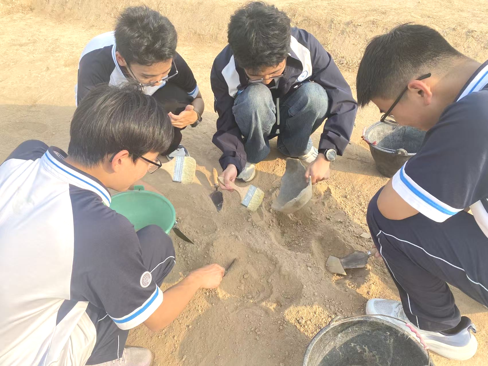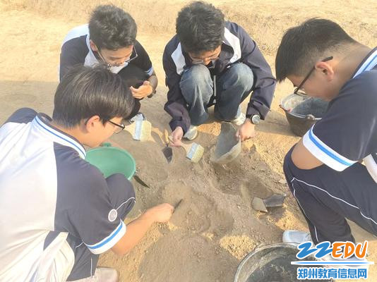 随后,师生一行来到2023年度全国十大考古新发现——商都书院街考古现场。这里留存着商代高等级贵族墓地、兆沟等重要遗迹,真实展现了商代社会的等级制度与丧葬礼仪。在专业考古人员的细致讲解下,同学们系统学习考古地层研判、文物科学发掘、遗址保护等专业知识,近距离观看考古工作者实地作业流程,真切感受考古工作的严谨、细致与艰辛。大家驻足探寻历史遗存,触摸千年土层,破除对考古工作的刻板印象,燃起对历史考古的浓厚兴趣。