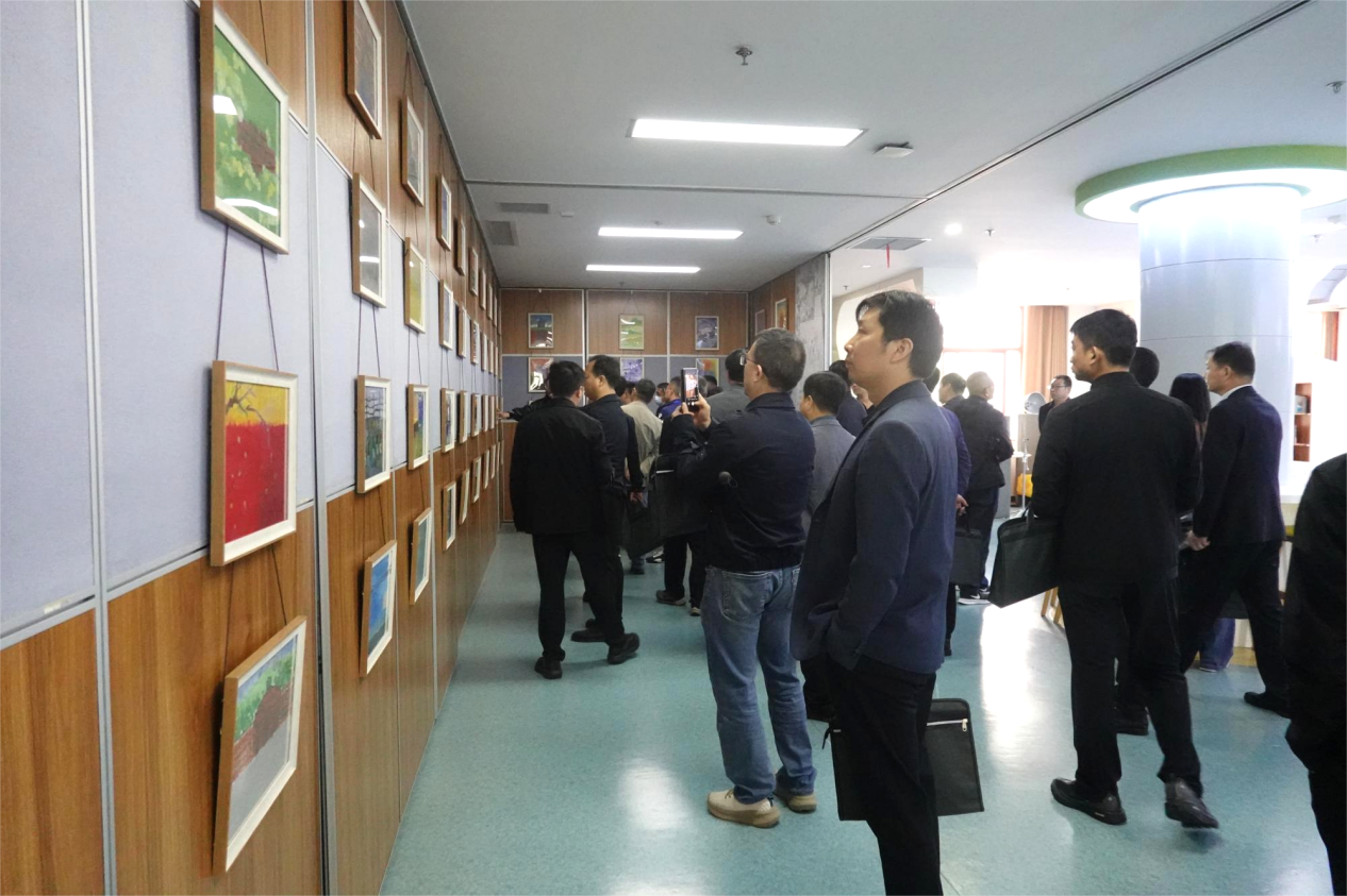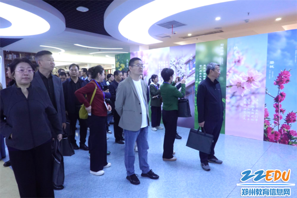 上午9点,研修班学员一行人首先走进平正楼图书馆,沉浸式感受校园文化氛围。一楼为师生书法绘画展,笔墨酣畅、意境悠远,尽显师生深厚的人文素养与艺术功底;二楼为“感春”系列主题展,包含“春花映师道”主题展、“行香子”诗词、数字诗等丰富内容,以校园春花、笔墨、诗韵融合校园风物与师道精神,意境雅致、意蕴深厚,全方位展现春日校园的生机与博雅文化底蕴;三楼为“画语心声”高二学生心理意象绘画展,同步展出师生优秀摄影作品,以艺术表达关照心灵成长,生动呈现学校以美育人、以心育心的教育实践。