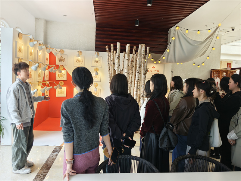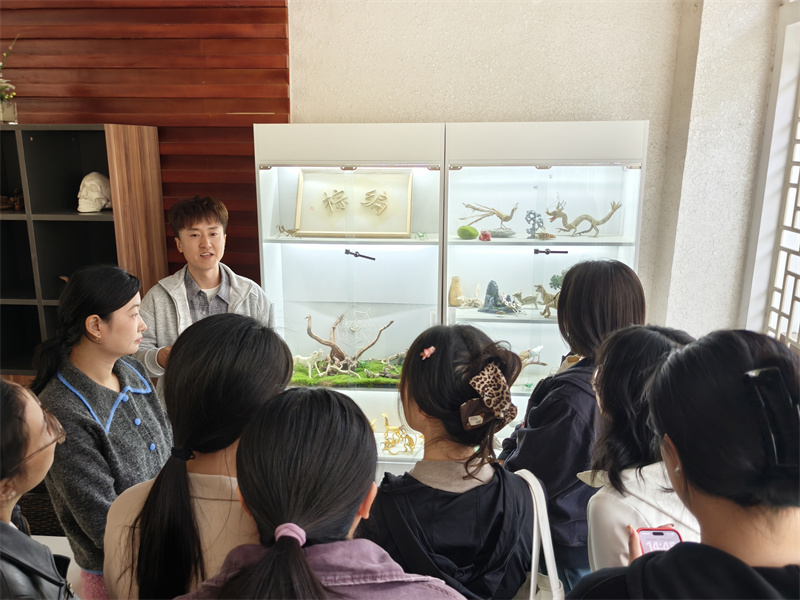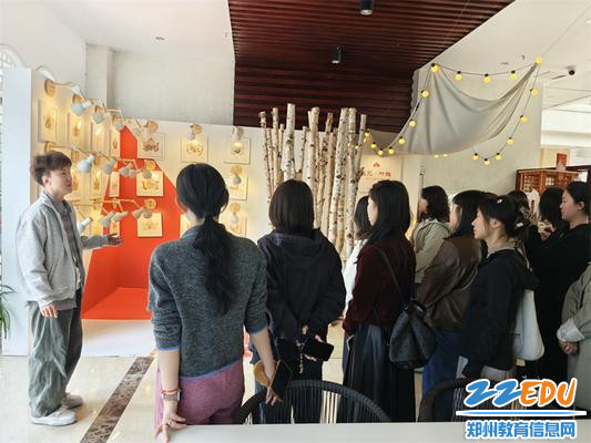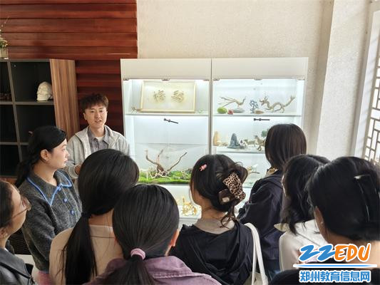 活动首站,老师们走进郑州市实验高级中学特色非遗展厅,欣赏校本课程《落叶的大千世界》和《棕编艺术》成果展。陈朝勇老师详细讲解展厅设计、课程架构与作品内涵,叶雕作品,以普通叶片为载体,精雕细琢,融自然意趣与艺术匠心于一体;棕编艺术则以棕榈叶为材,编织出蚱蜢、青蛙等灵动小动物,栩栩如生。现场老师无不感受到自然材料与非遗技艺融合的艺术魅力,沉浸式领略高中特色美育课程的建设成果。