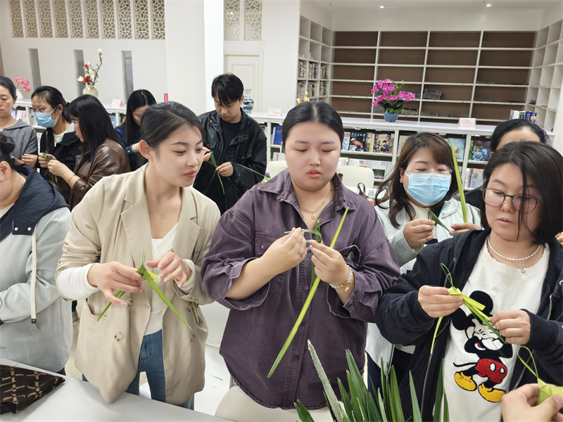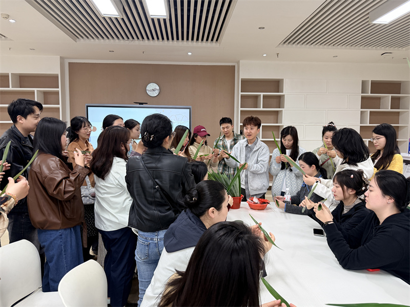 在实践体验环节,老师们亲身体验棕编技艺。在两位老师的指导下,新鲜棕叶在指尖穿插、扭转、翻飞,化身为一只只灵动的小蚱蜢 。虽技法颇有难度,但众人专注投入,在亲身实践中感受非遗手工的创作乐趣,最终都完成了专属作品,在指尖艺术中体悟古代劳动人民的智慧与平凡生活中的乐趣,更对非遗文化进校园、美术课堂实践创新有了全新的认知与感悟。