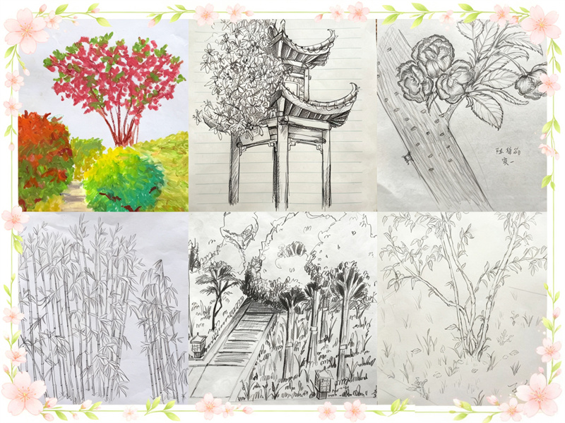 和煦的春光洒满校园,繁花盛放、草木葳蕤。同学们放下书本,漫步于校园各处,静心观察身边的一草一木、一花一石,在阳光与花香中感受自然之美,寻找创作灵感。陈老师则全程陪伴,耐心为同学们讲解取景构图、色彩运用等技巧。尽管绝大多数同学都是绘画零基础,线条略显稚嫩,色彩搭配也稍显生涩,但大家依旧满怀热情、大胆落笔,用简单的线条、鲜活的色彩将自己眼中独一无二的春天定格于画纸之上,每一幅作品都独具生命力。