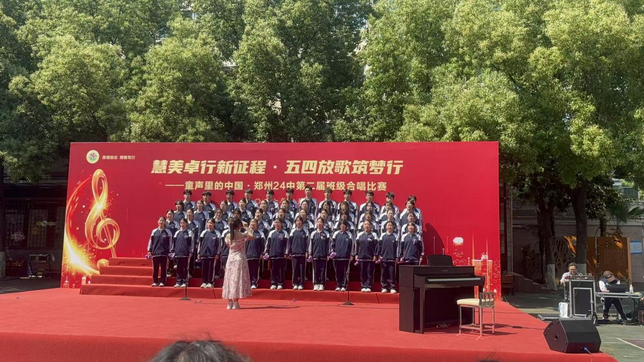 为传承五四精神,厚植爱国主义情怀,丰富校园文化生活,展现新时代青年学子朝气蓬勃、奋发向上的精神风貌,2026年4月30日下午,郑州市第二十四中学“慧美卓行新征程 五四放歌筑梦行——童声里的中国”第二届班级合唱比赛在学校西操场举行。全校师生以歌声献礼五四青年节,以青春致敬新时代。