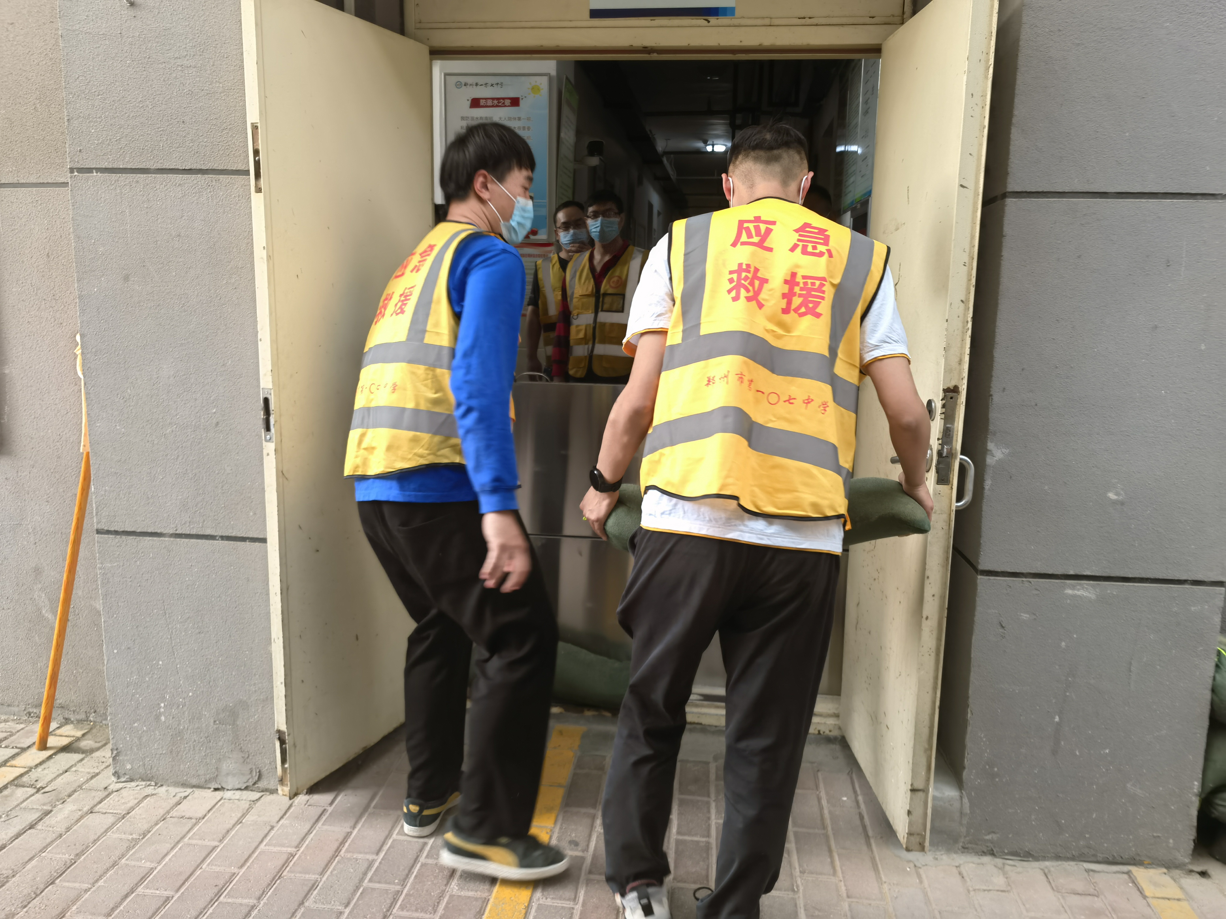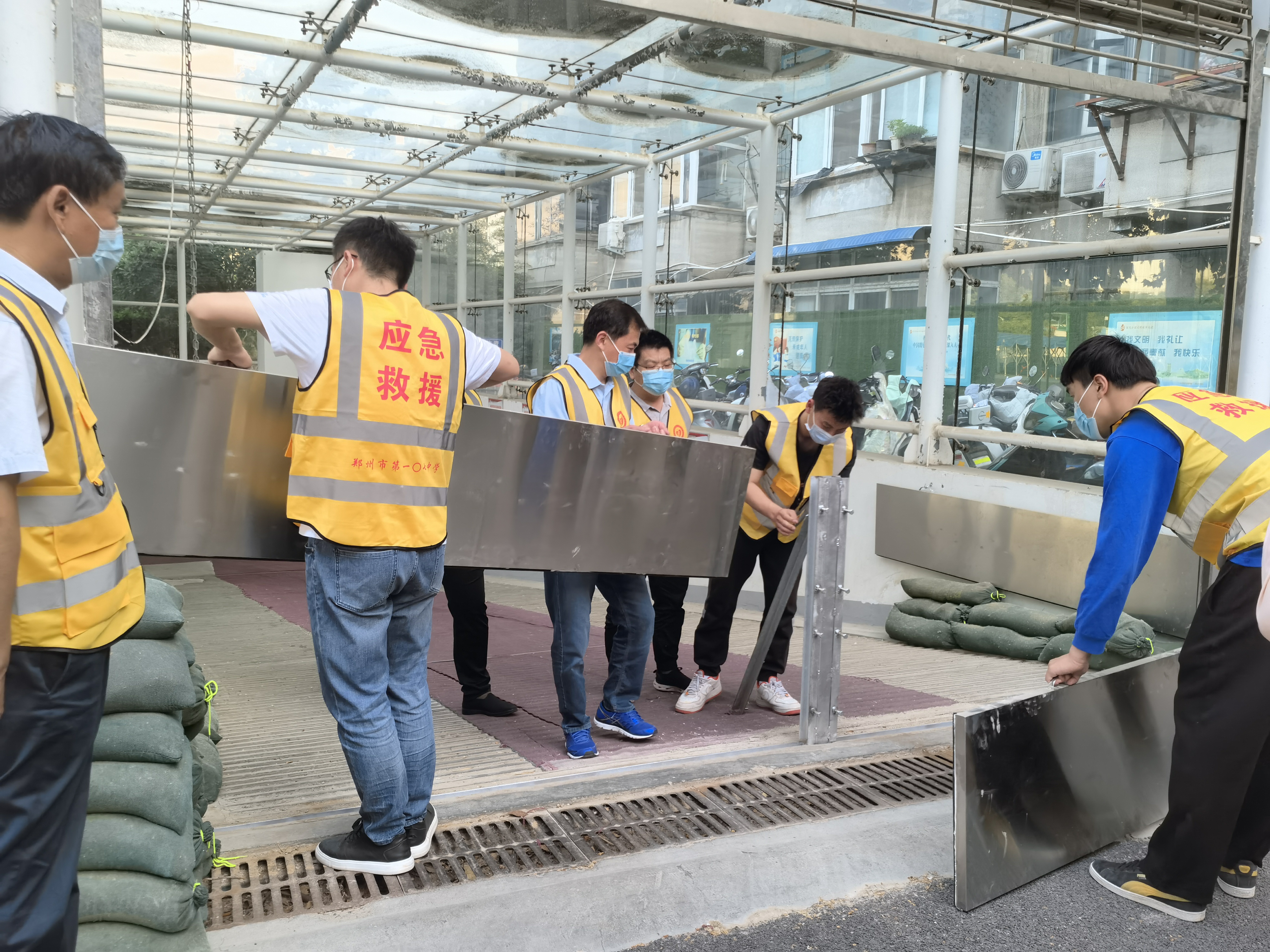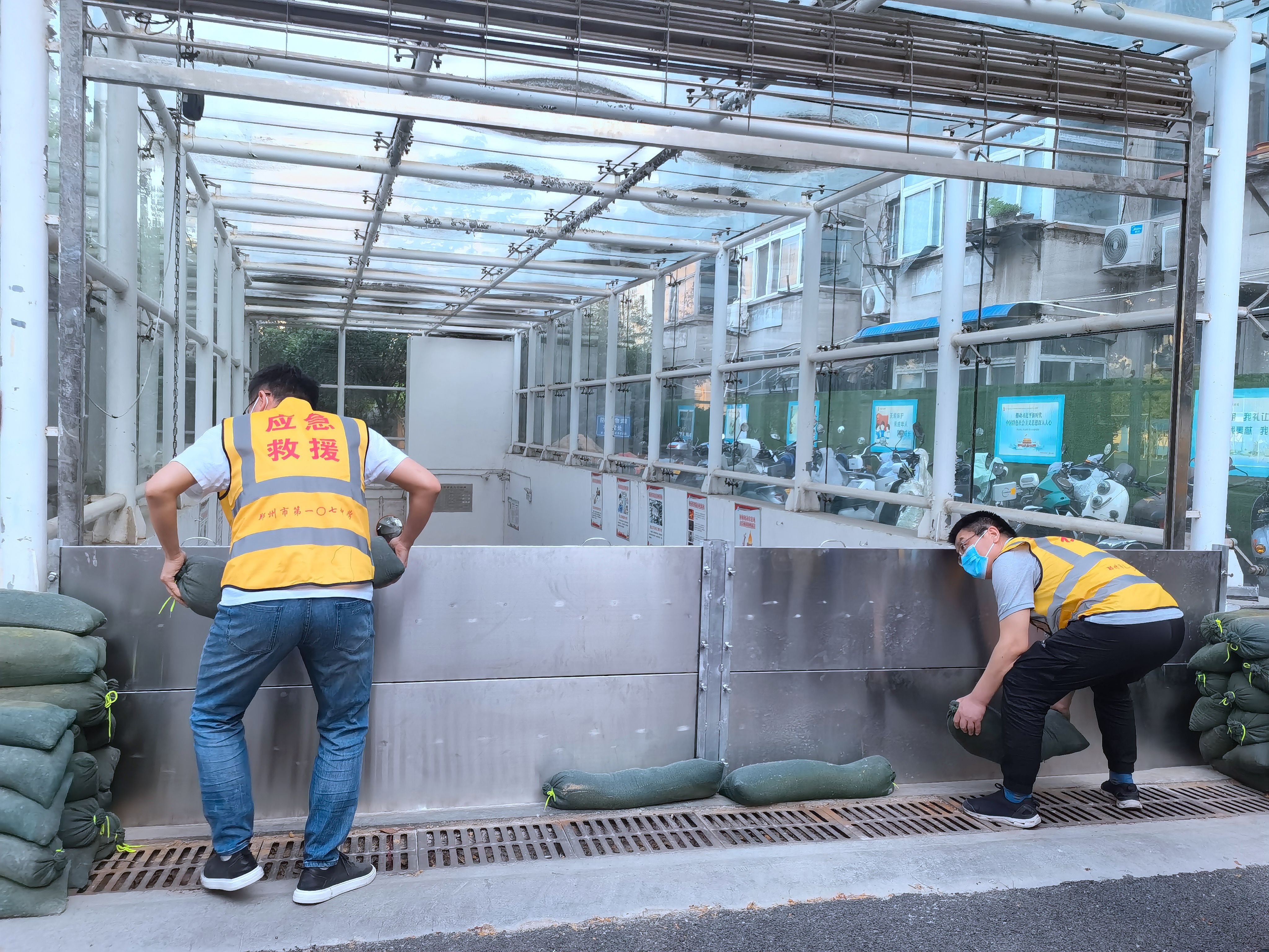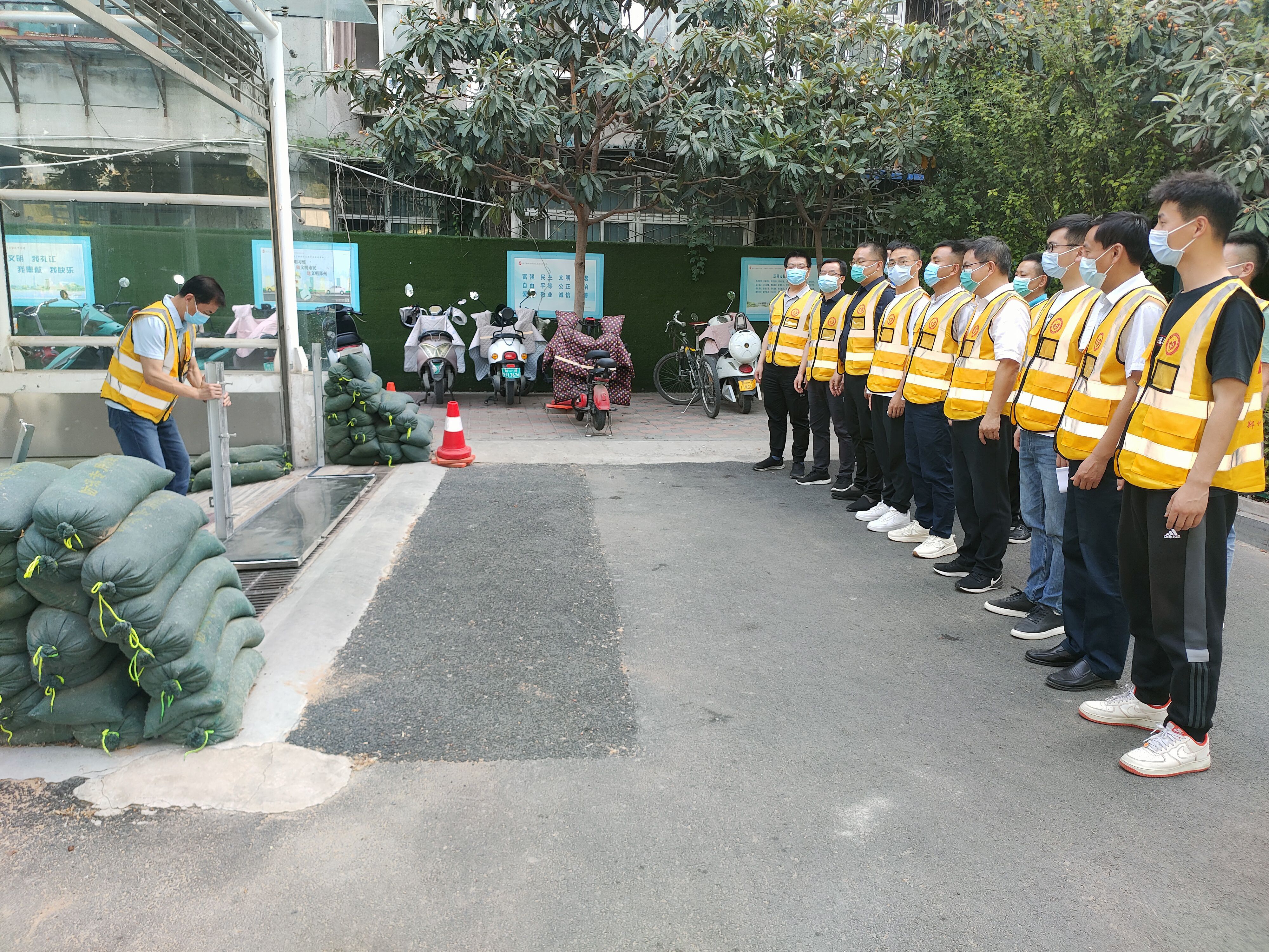 17点30分,郑州市第一〇七高级中学防汛总指挥长刘志义一声令下,演练正式开始,6个应急处置队伍全体出动。校园内有条不紊地进行排涝和防汛抢险,抢险一组用防汛挡板及沙袋封堵地下车库入口,防止积水大面积进入车库;抢险二组对配电房进行挡板安装、沙袋封堵;抢险三组在校门口安装防汛挡板,防止洪水涌入校园;抢险四组在教学楼各个门口封堵沙袋,防止水位过高进入教学楼;抢险五组协助宿管安装防汛挡板和沙袋。抢险六组第一时间备好抽水泵,随时待命。防汛指挥现场,总指挥长刘志义全程关注现场情况,与现场抢险救援队伍上下联动,实时调度指挥,充分展示了学校应急处置队伍“召之即来、来之能战、战之能胜”的良好精神风貌。