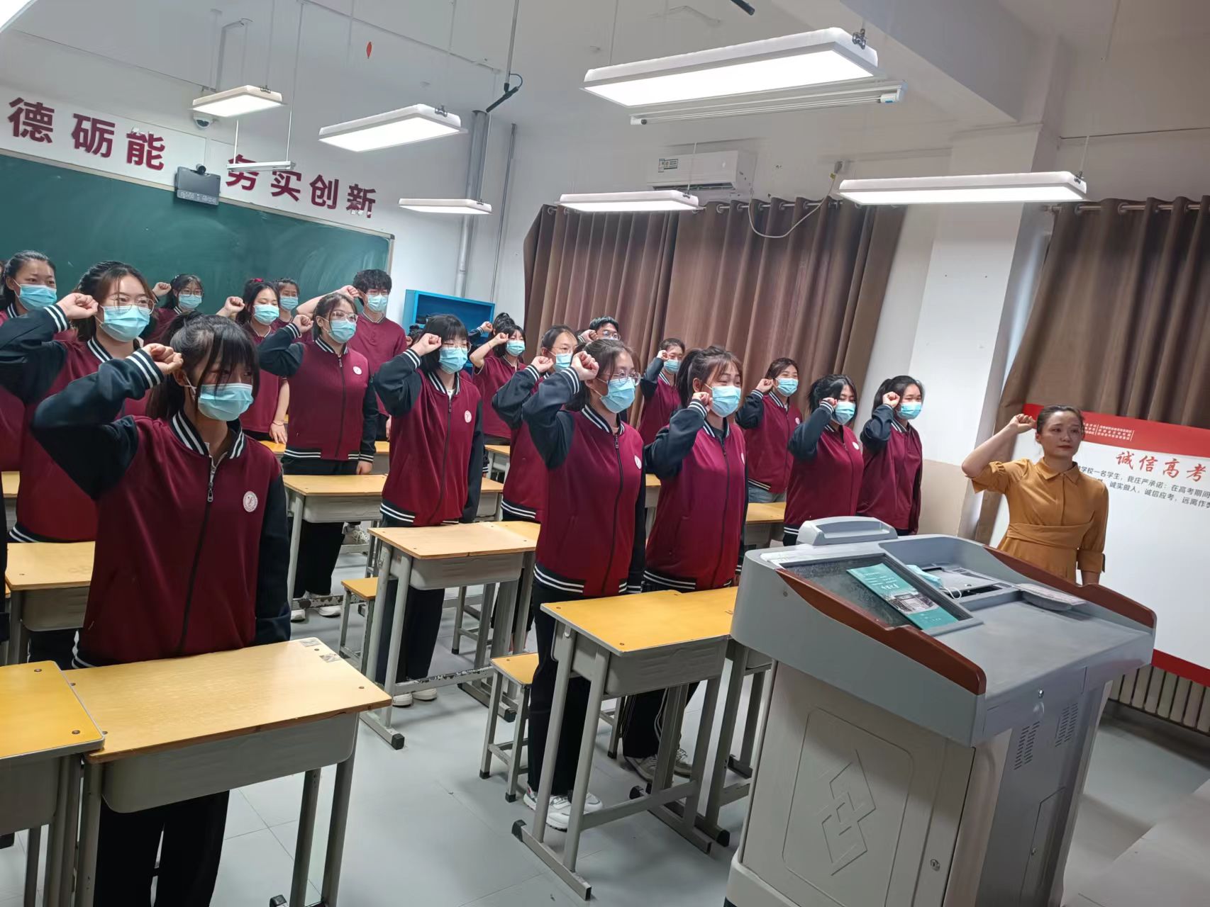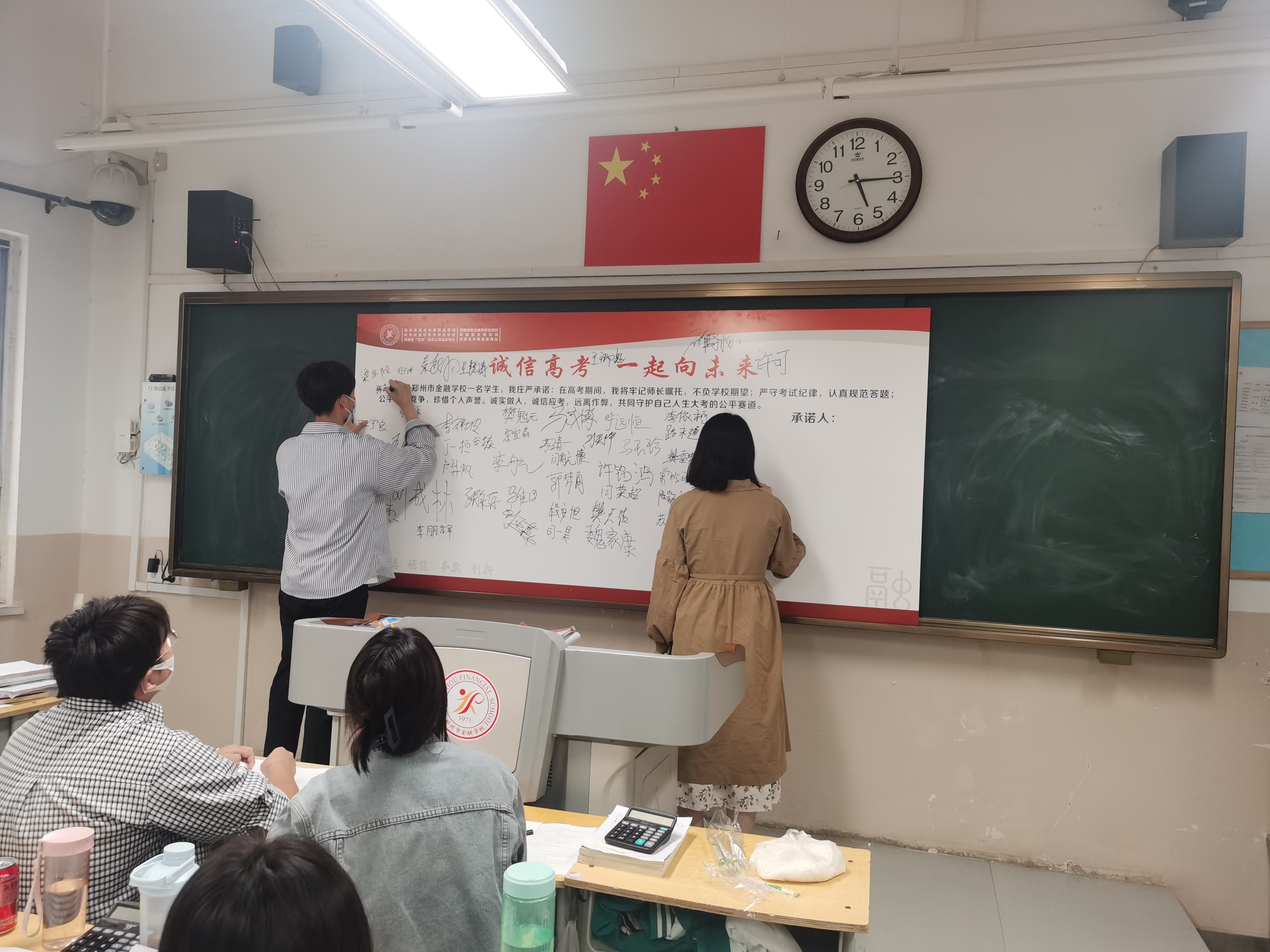 在随后的诚信考试宣誓环节中,学生们全体起立,庄重严肃地举起右手,发出了“诚实做人,诚信应考,远离作弊,共同守护自己人生大考的公平赛道”的誓言,在高考诚信墙上庄重地签下了自己的名字,并纷纷表示,要坚持诚信考试,诚实做人,用扎实的知识、良好的品格向老师、向自己交上一份满意答卷。