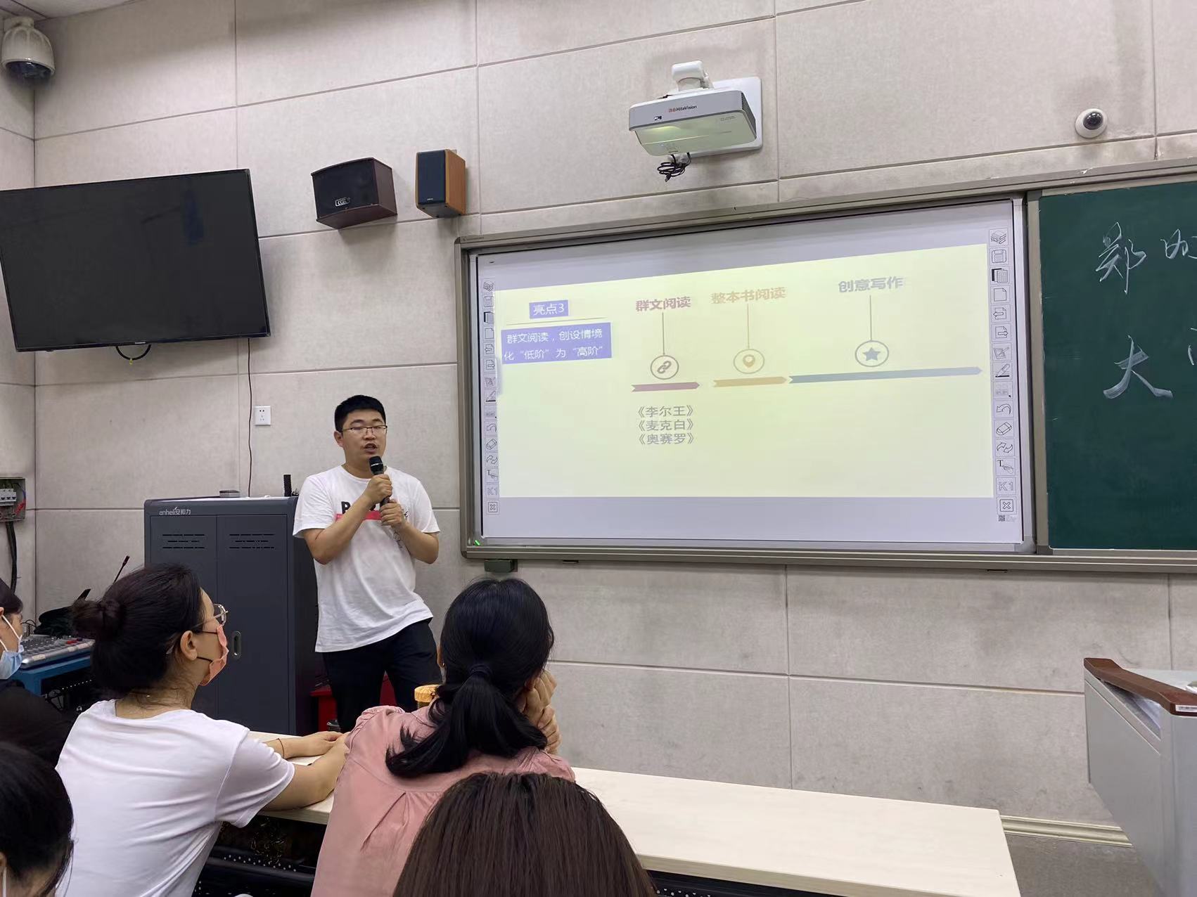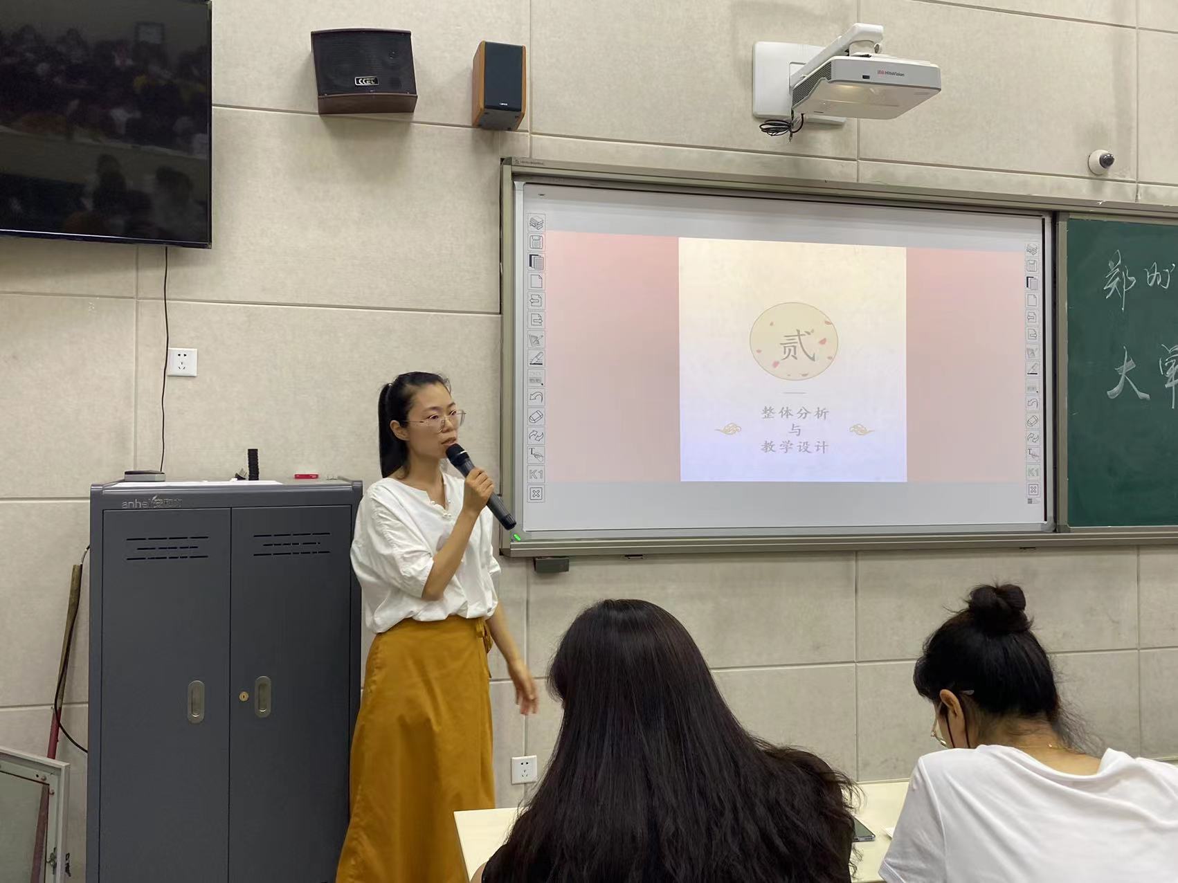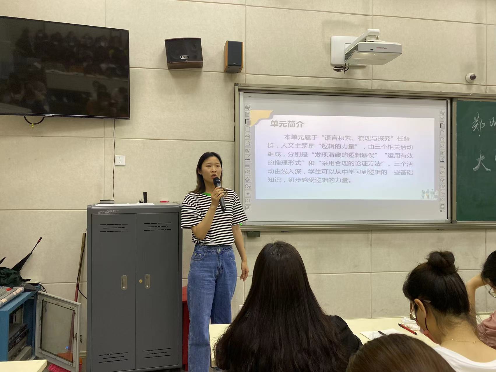 语文组教师查经杨和王金姣老师作为语文组教师代表进行发言展示。两位老师从不同的单元设计出发,通过对比上学期的大单元教学经验,不断调整教学目标,优化教学过程,丰富教学情境环节,最终由单一的章节串联成整个单元,不断培养学生的综合逻辑思维能力,并向课本教材回归,实现教学目标的达成。