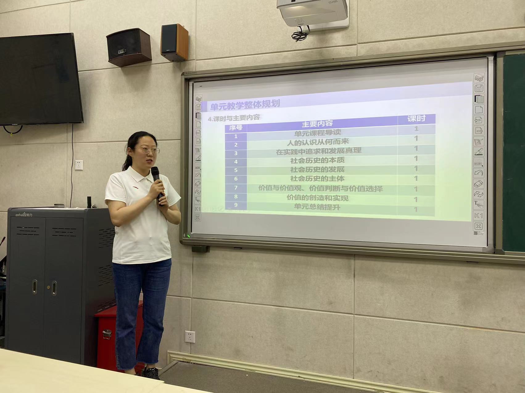 政治组教师朱宏升和秦如男老师作为政治组教师代表进行发言展示。两位老师也是从不同的单元章节出发,展示了各自的教学情况。通过对比不同年级学生上课的情况,关注初高中差异度,结合课标要求,分析单元地位,通过对比上学期教学差异,不断优化调整教学环节,并在教学过程中区分不同课之间的关联,不仅注重课与课之间的联系,还要关注单元之间的联系,从而将单一的大单元设计逐渐向整本书的大单元设计靠近。在整合碎片化知识的过程中,提升学生的认知能力,最终通过情境的创设,将课本知识转化为实践知识,巩固学习成果。