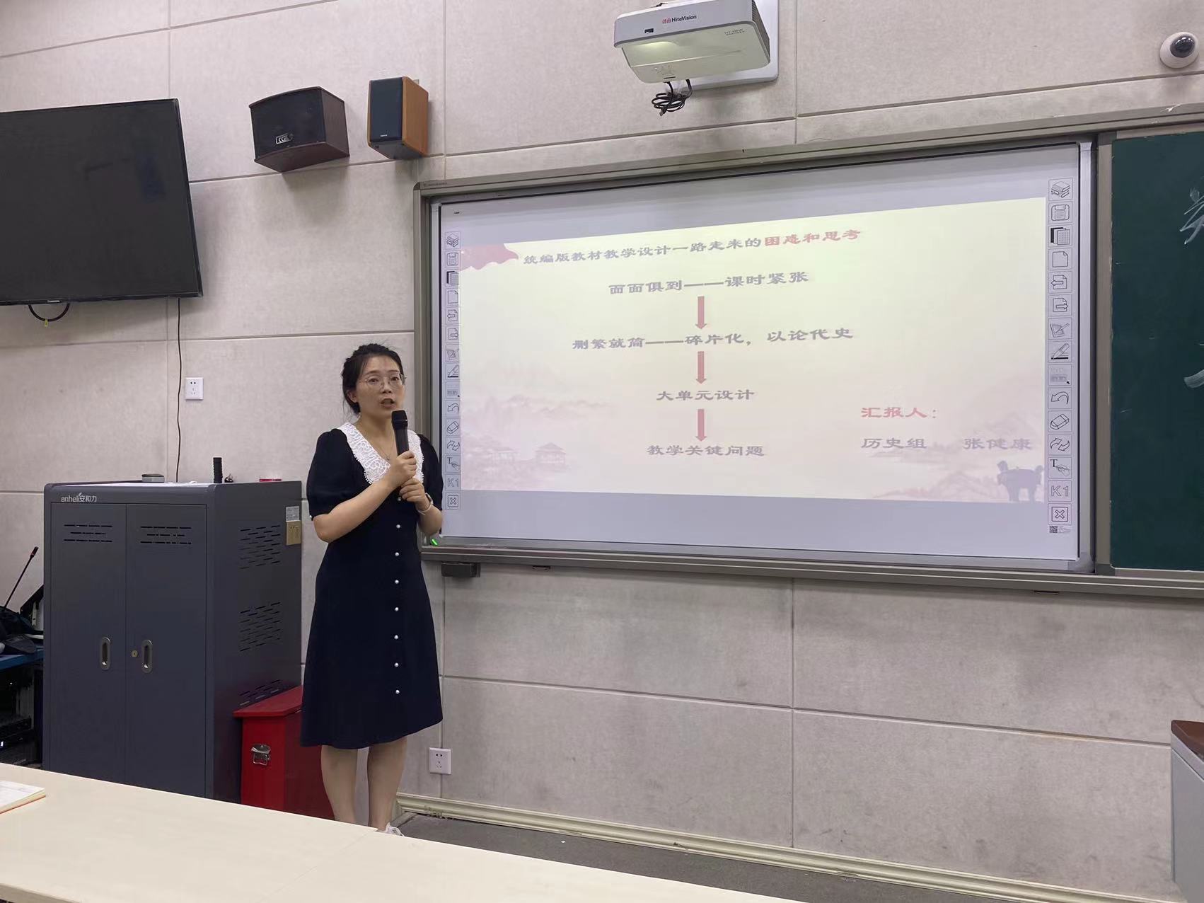 历史组教师张健康和李卉敏老师作为历史组教师代表进行发言展示。两位老师通过解读课标和教材分析,发现教材的特点,并通过研究学情,精心设计教学的重难点,并通过利用多样化的教学资源,依据问题链的设计,层层深入,最终达到启发学生思考、回归教材主旨、激发学生爱国情怀的目的。