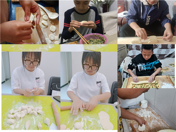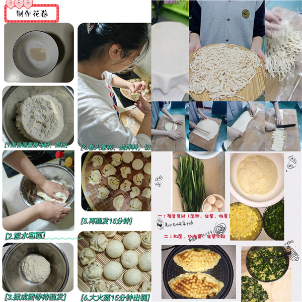 学生根据家庭的饮食风格,以面粉为主要食材,在劳动节假期期间居家制作不同的面食,如饺子、包子、面条、花卷、馒头等。从前期食材准备,到成品完成,学生全程参与面食制作,在家人陪同和指导下享受着温馨的亲子时光。学生通过图片、视频记录面食制作过程,完整呈现自己精湛厨艺。部分学生制作美食的过程详实,视频还配有讲解和字幕等,更凸显了学生的全面发展。