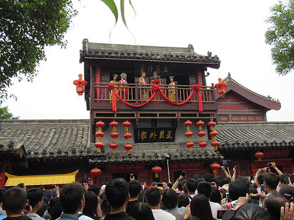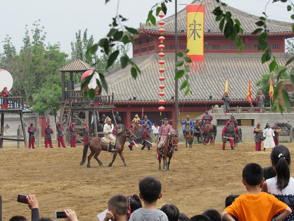 “王员外开始招婿了”,楼上千金抛绣球了!人山人海,好不热闹!看,有两个学生穿着宋裝,坐在了大宋考场,正在接受皇帝的殿试。最最精彩、最最刺激的还是“岳飞枪挑小梁王”,校场比武,战马驰骋,浓烟滚滚,“精忠报国”的岳飞武艺高强,不畏权贵,校场一展风采!“怒发冲冠,凭栏处,潇潇雨歇。……待从头,收拾旧山河,朝天阙!”岳飞的《满江红》响彻上空。观众群情激昂!