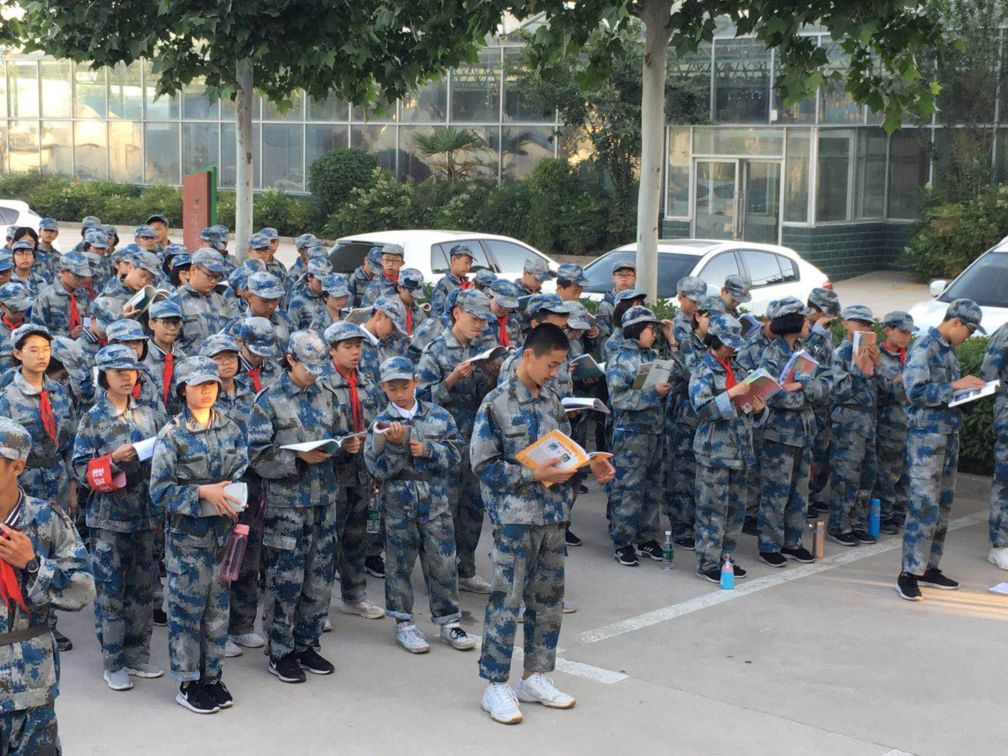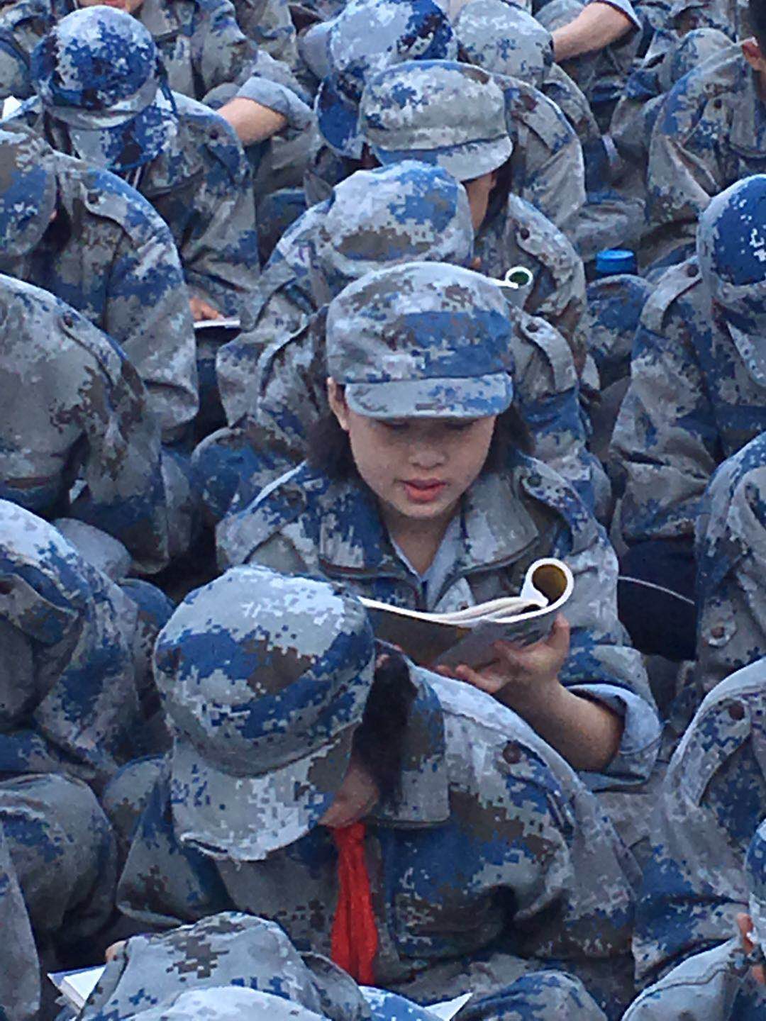 早上六点整,同学们踏过晨露,伴着虫鸣,走着整齐的步伐,在餐厅旁边的广场集合。跟其他学校的队列不一样的,是同学们人手一本书,然后在教官的组织下席地而坐,霎时,郎朗的读书声响彻广场。
