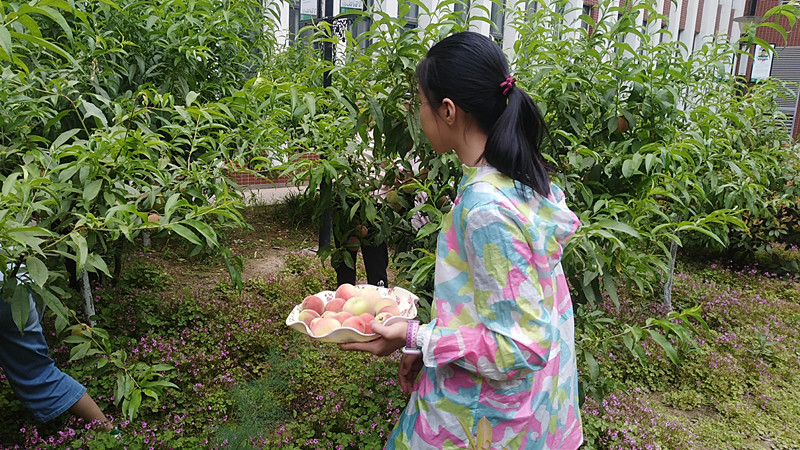 摘桃前,大家先接受了园林师傅的培训:摘哪种、怎么摘等注意事项,这些大家听得专心致志,毕竟是为稍后的摘桃做准备!摘桃正式开始,两人一组,一人摘桃、一人端盘。看呀,端盘的同学明显不过瘾,很快就自己动手、丰衣足食了。大家都在比观察、比速度,哪里有个熟透的、哪个桃子最大,都逃不过同学们的眼睛,短短十分钟,一个篮子已经装满了鲜桃。