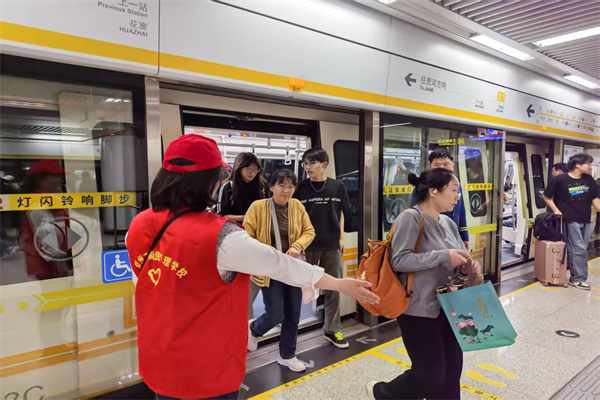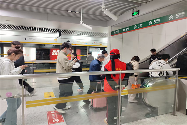 志愿者在自动扶梯处为乘客提供志愿服务