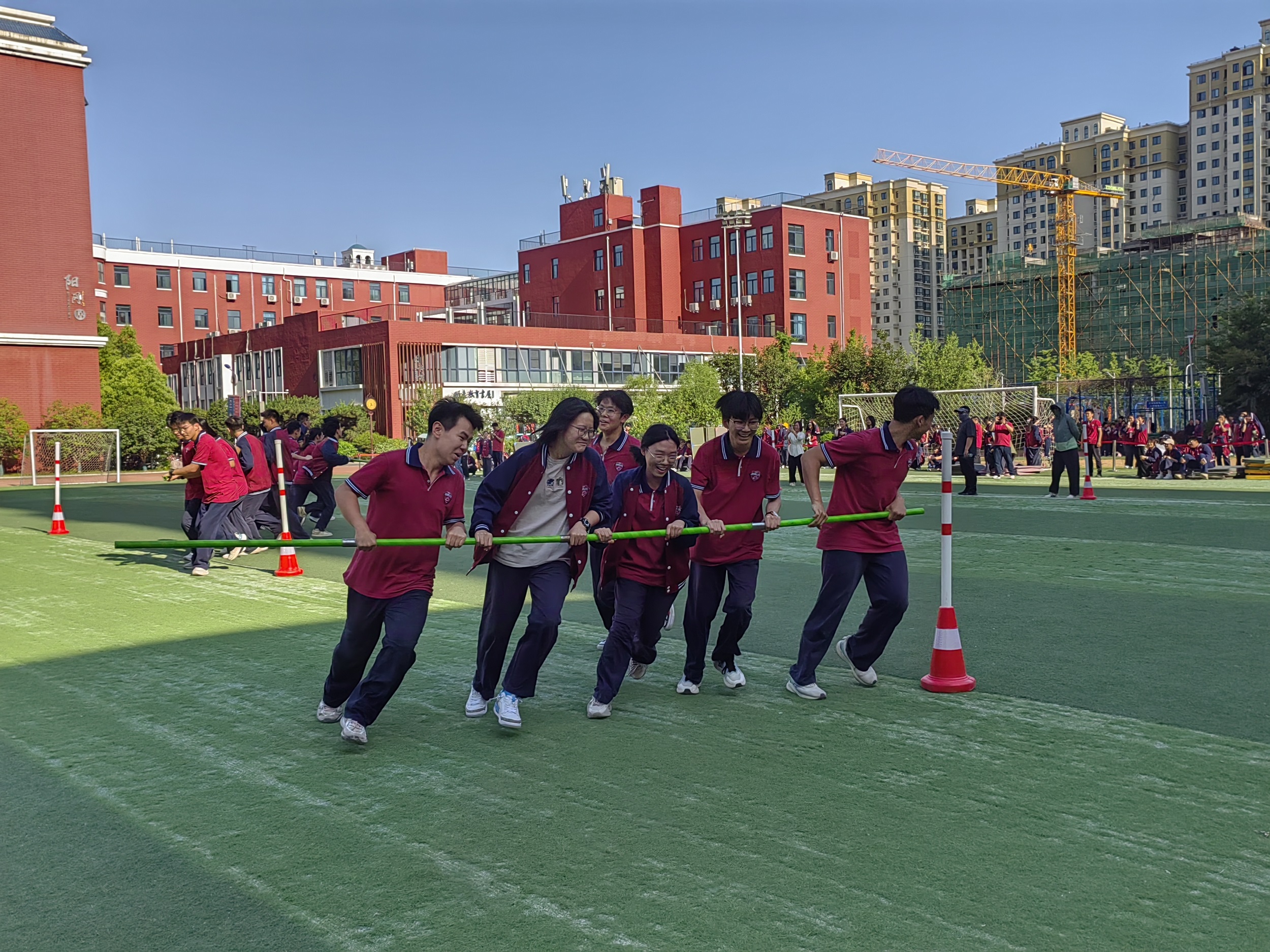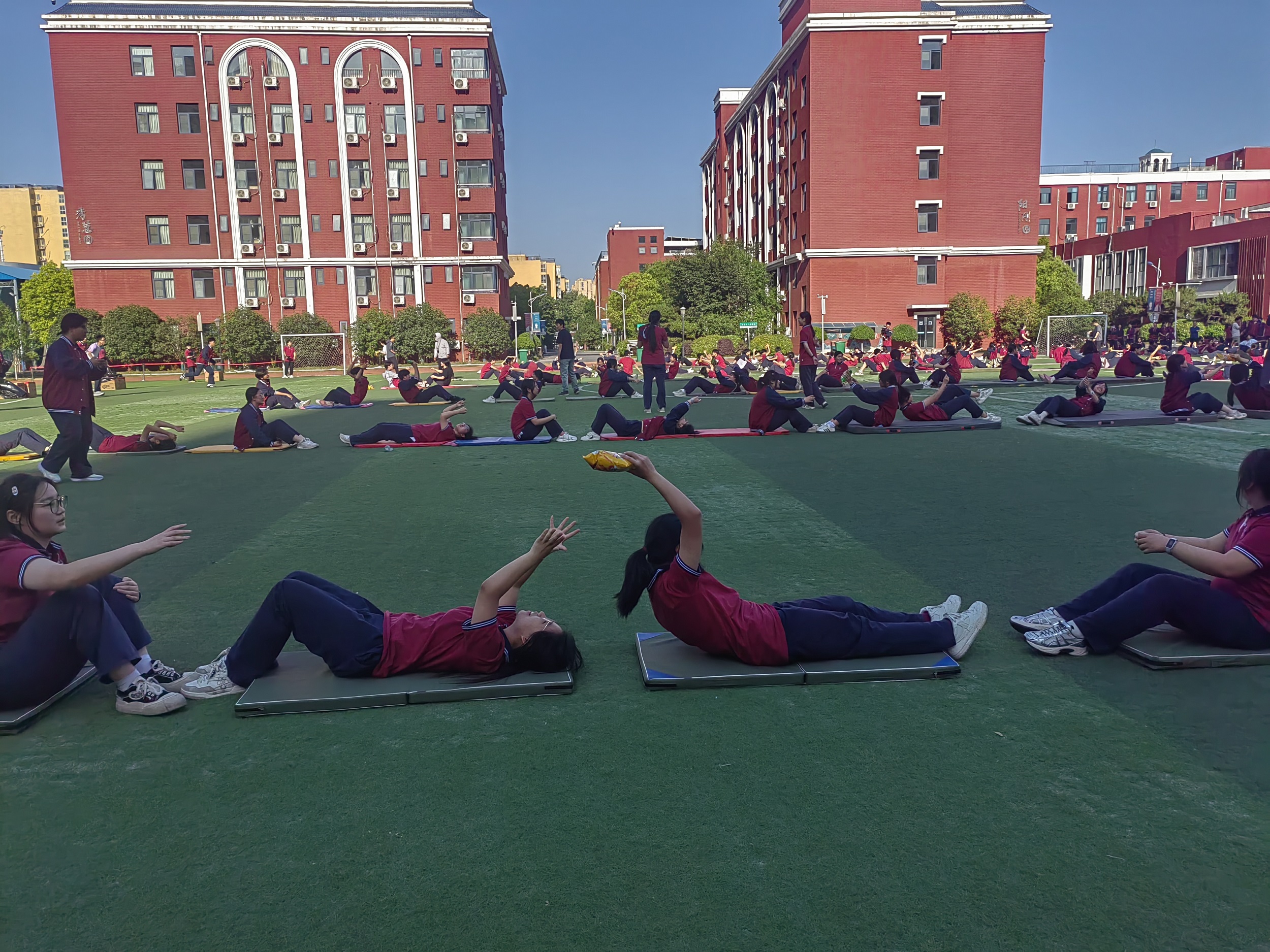 本次趣味运动会共设置了三个比赛项目:旱地龙舟、旋风跑和运物接力。每项比赛均安排6个班级同时进行,以确保活动的高效与趣味并存。在“旱地龙舟”项目中,每班选出男女生各5名参赛,迎面接力,各班参赛队齐心协力,奋勇争先,划动着“龙舟”在足球场上疾驰,展现了团队的力量与默契。“旋风跑”项目中,每班选3名男生和2名女生,进行50米往返跑,中间经过标志物,要围绕其转一圈,选手们手持旋风杆,快速旋转奔跑,场面既紧张又刺激。“运物接力”项目中,各班26名学生参加,选手利用瑜伽垫、中号垫子和小号垫子进行接力传递零食,学生需要躺在垫子上,通过做仰卧起坐,完成运物接力,既考验了速度,又考验了团队协作能力。赛场上,选手们拼尽全力,赛场外,班主任们也给队员们加油、鼓励。