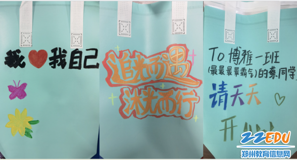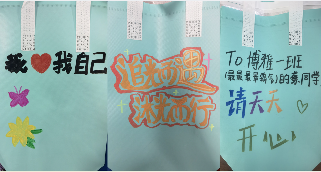 从“心”开始,学会真正爱自己!紧接着,同学们纷纷在袋子上书写一些温暖、治愈、让自己内心欢喜、充满能量的话,为自己赋能。