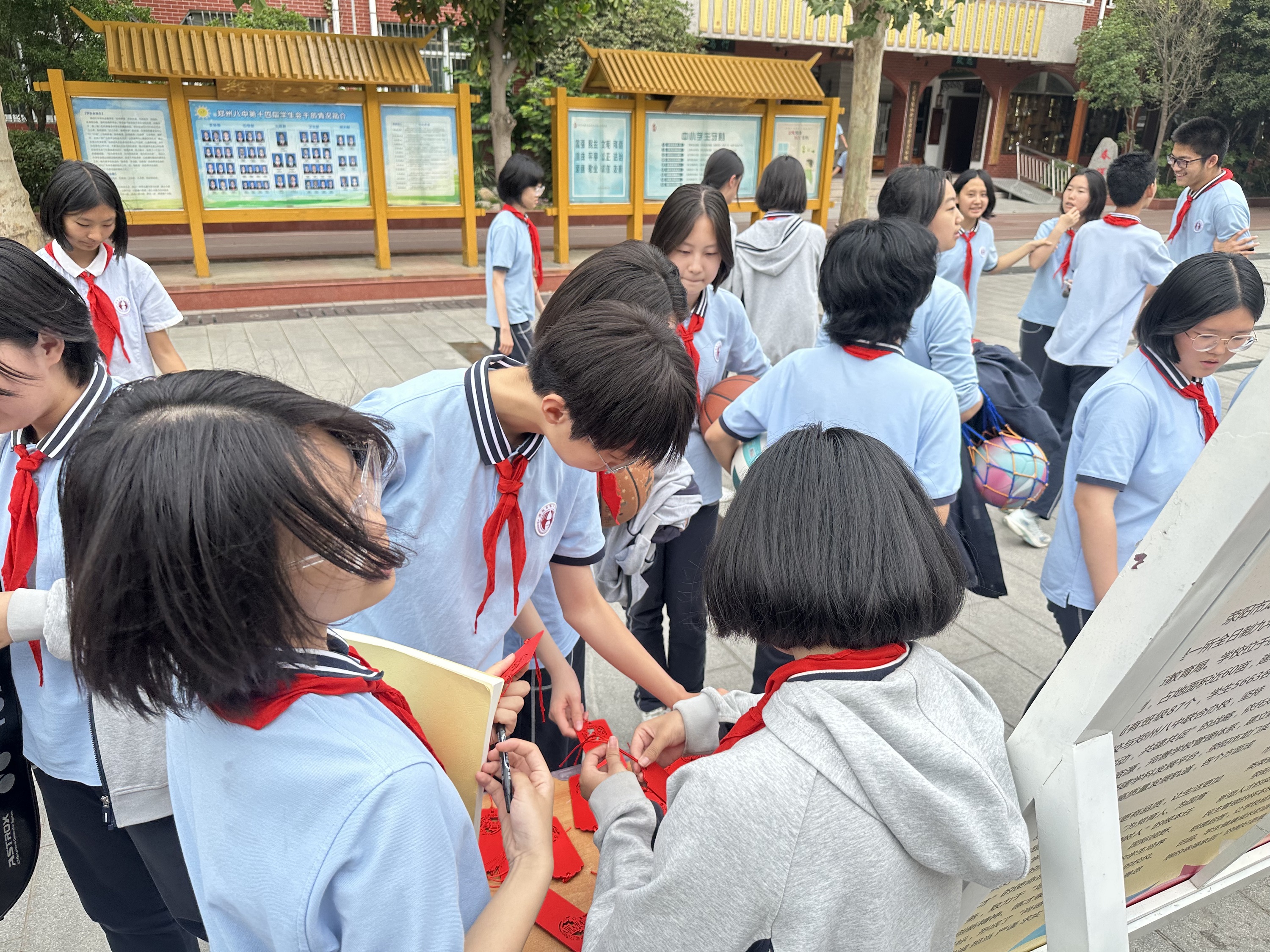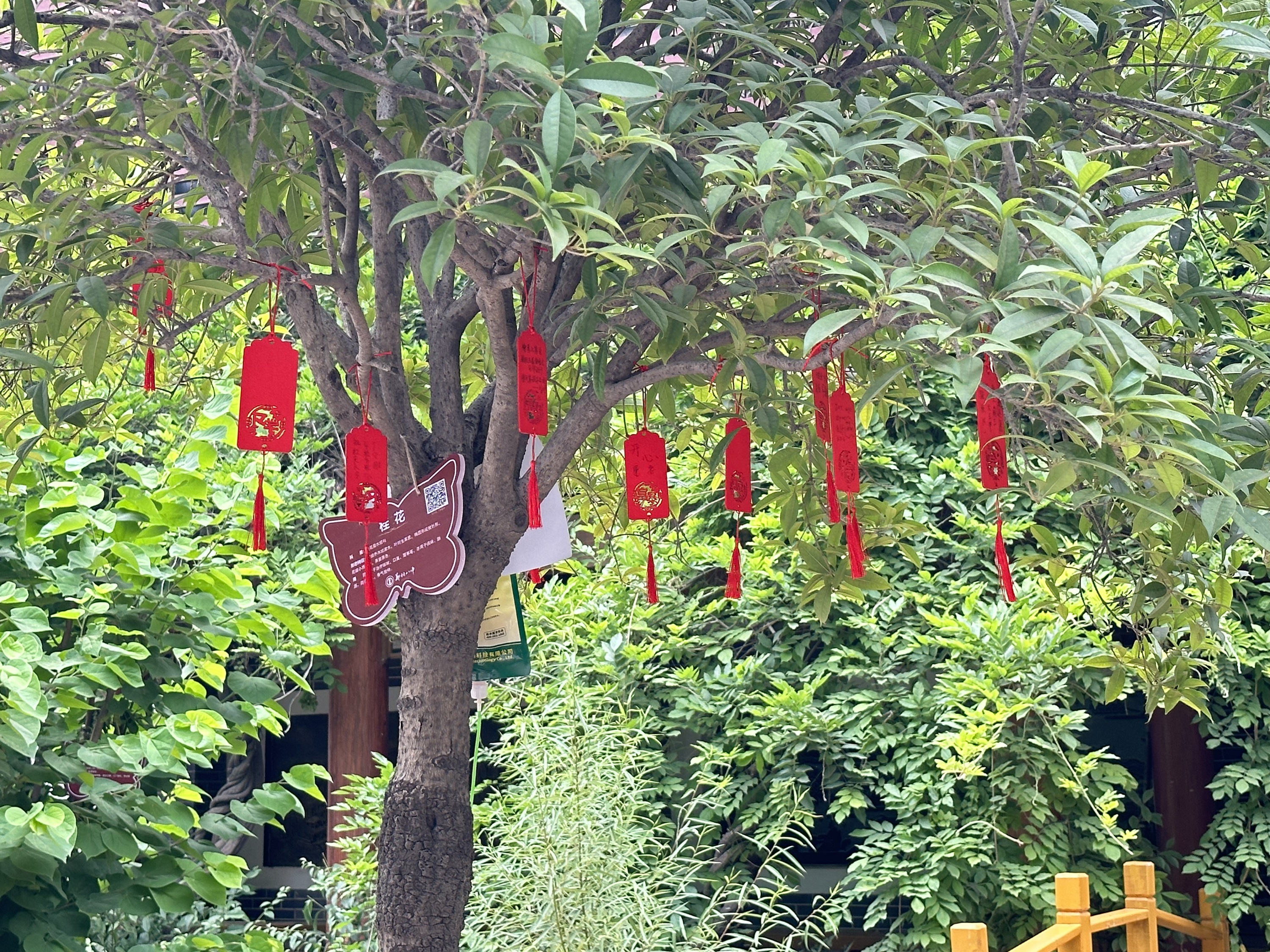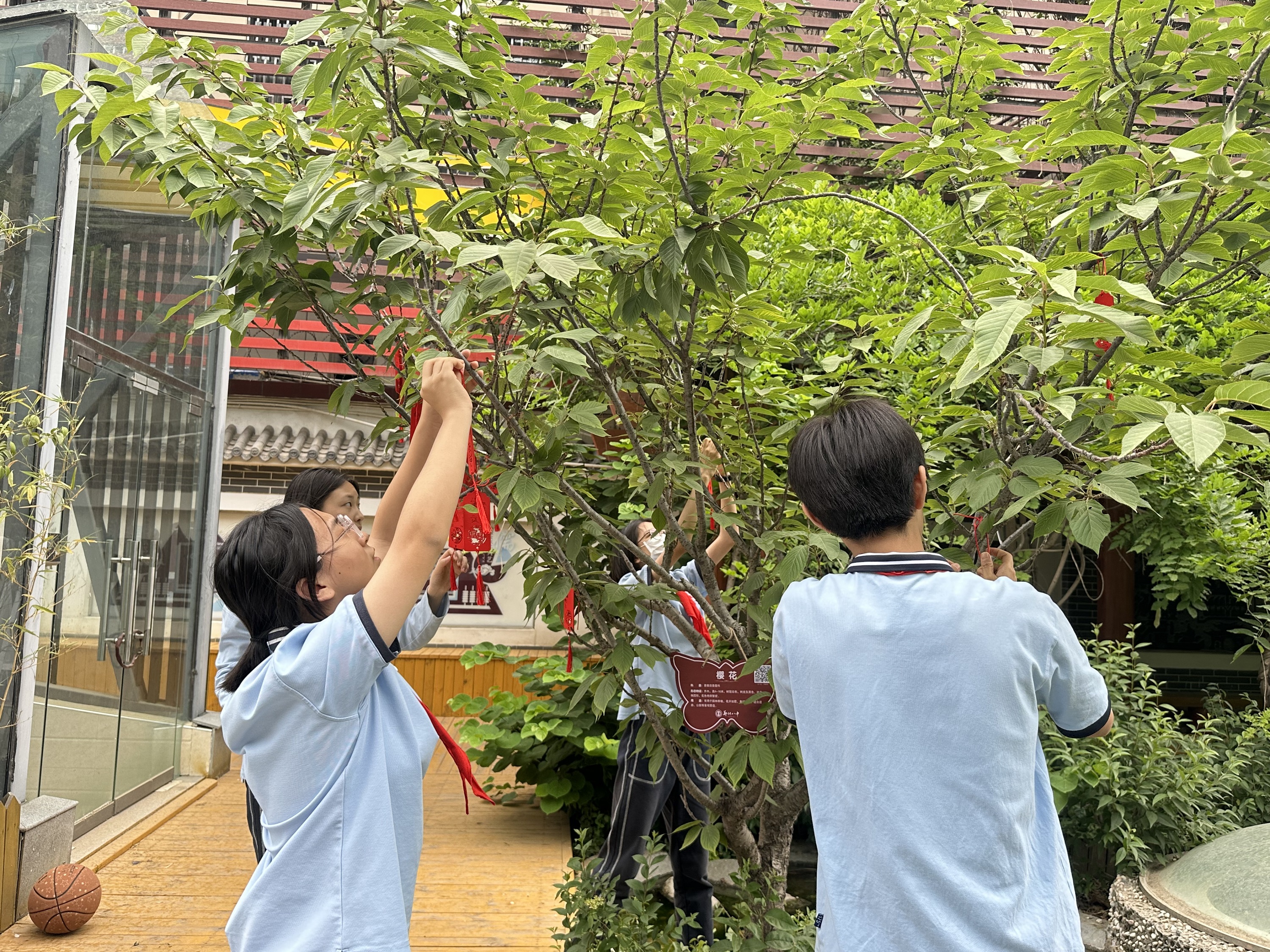 写好许愿牌后,同学们在老师的组织下,有序地将红牌牌挂在了学校的各个树枝上。一时间,校园里的树木仿佛变成了一棵棵“许愿树”,挂满了同学们的梦想和祝福。微风拂过,许愿牌轻轻摇曳,仿佛在诉说着同学们的心声。
