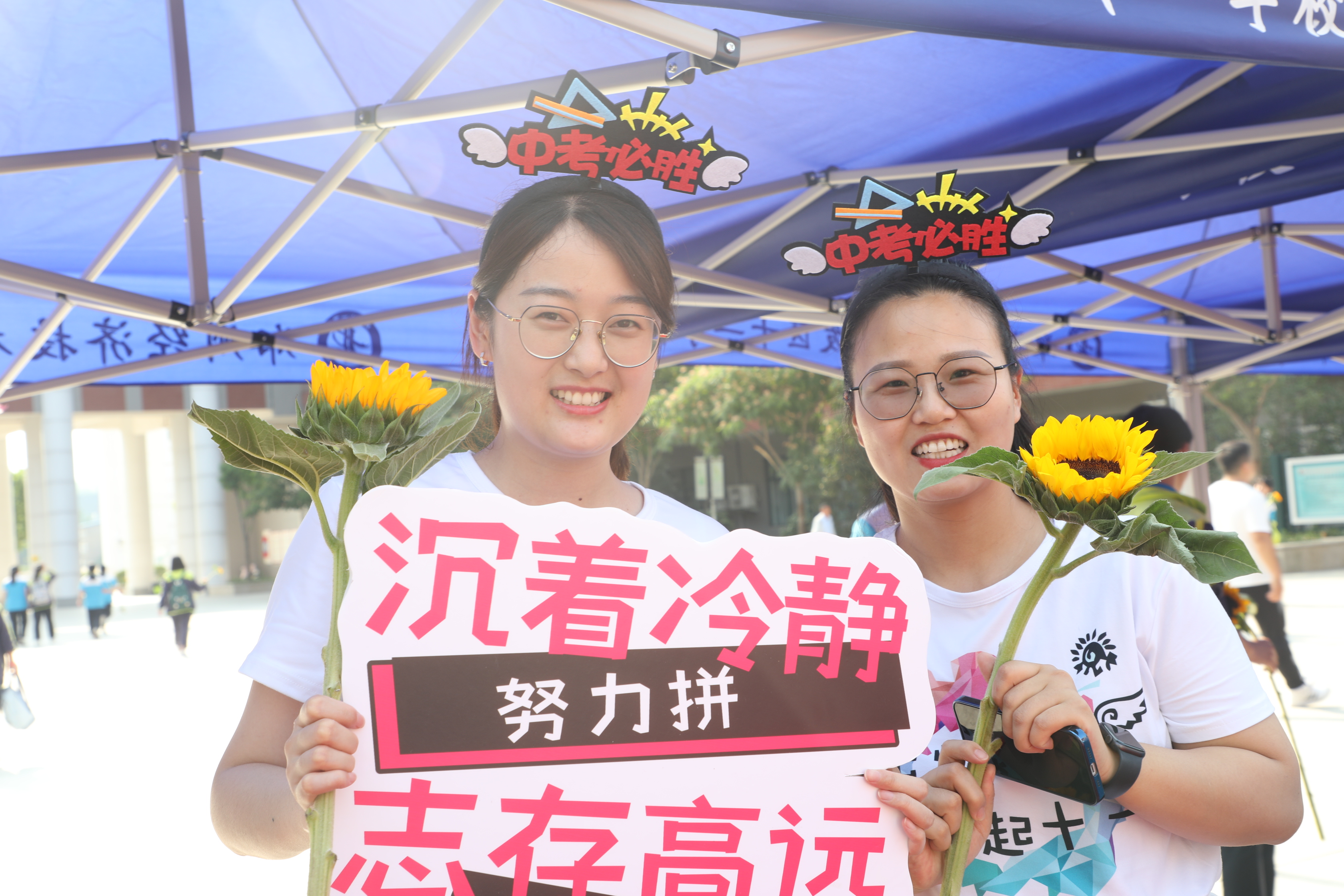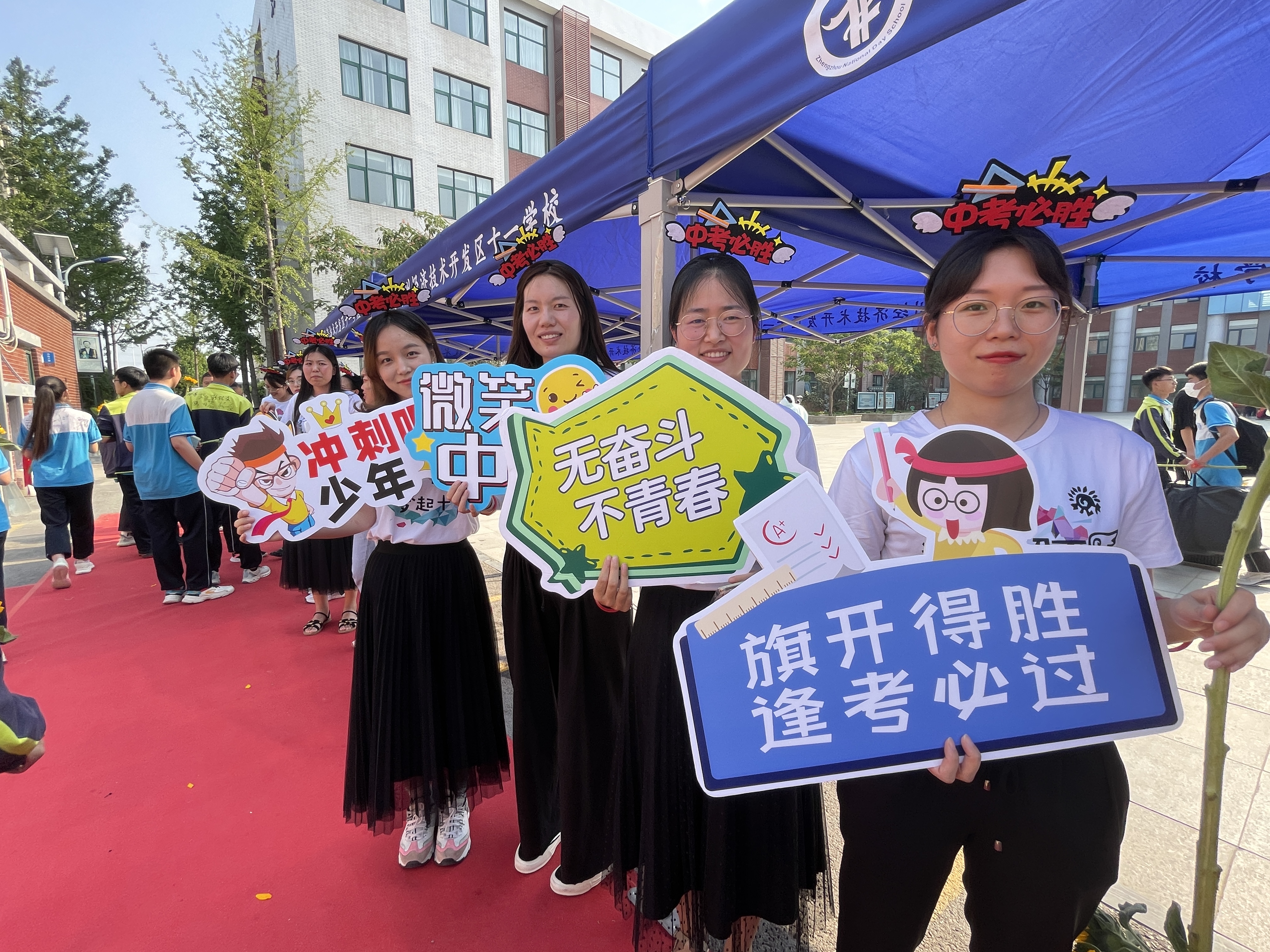 学校明理路两旁,七、八年级的学弟学妹高举条幅,为即将决战中招的九年级学长学姐助威壮行。他们当中的志愿者来回奔走,帮忙搬运物品,为九年级学长学姐的赴考之行增加一抹亮色。