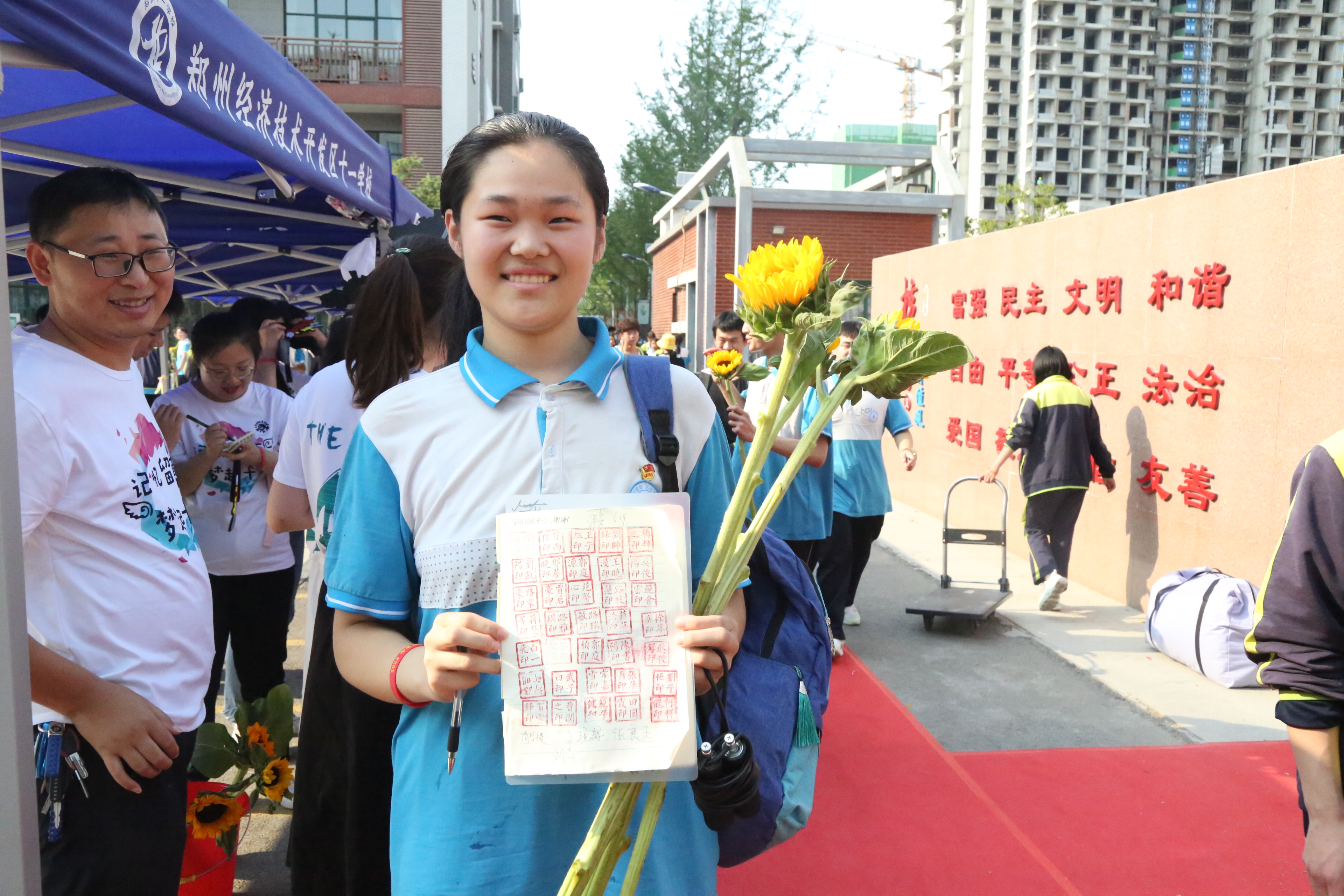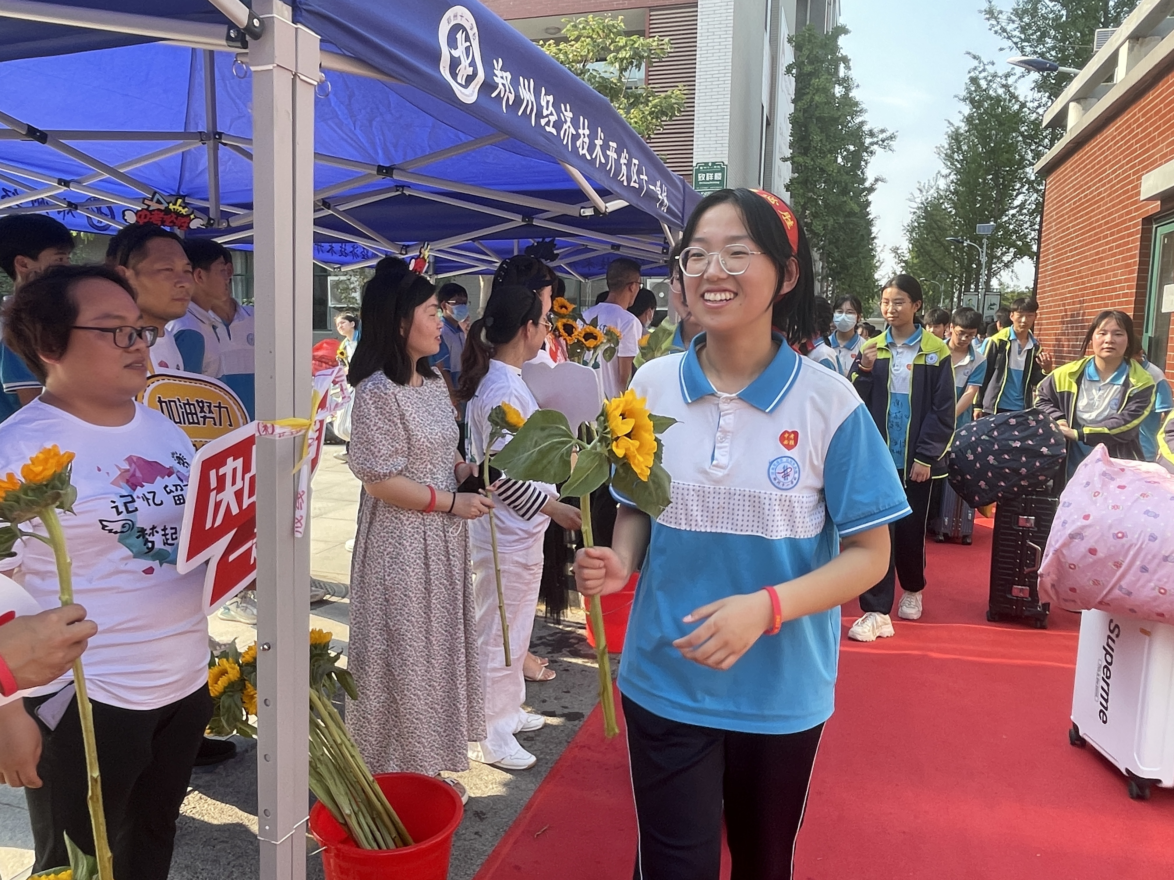 学生们沿着校园里红毯铺就的路径,一眼就能看到老师们一个个手拿向日葵,热情地欢呼着、真诚地祝福着即将踏入考场的他们。