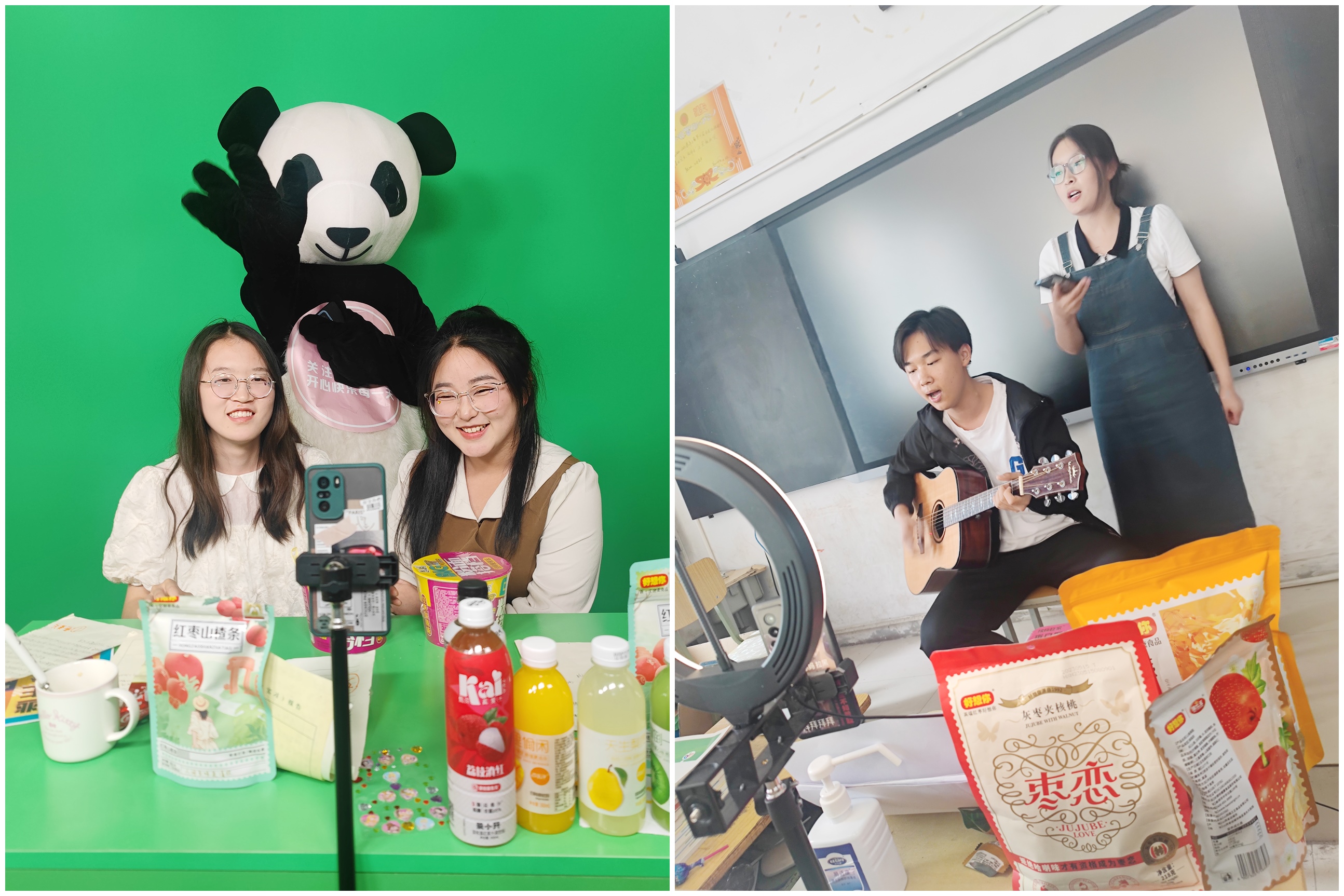 网络直播虽早已走入师生生活,但参与直播带货尤其是“当主播”对很多人来说还是第一次。直播当天,各电商小组的主播齐上阵,利用抖音、快手直播平台,大方得体地与线上观众进行互动,娴熟流畅地进行直播促销。学校师生踊跃参与,直播间气氛热烈。直播之外,校园里每天都有线下产品推介活动。同学们或搭建摊位,或“登门拜访”,使出浑身解数向师生宣传自己的产品。